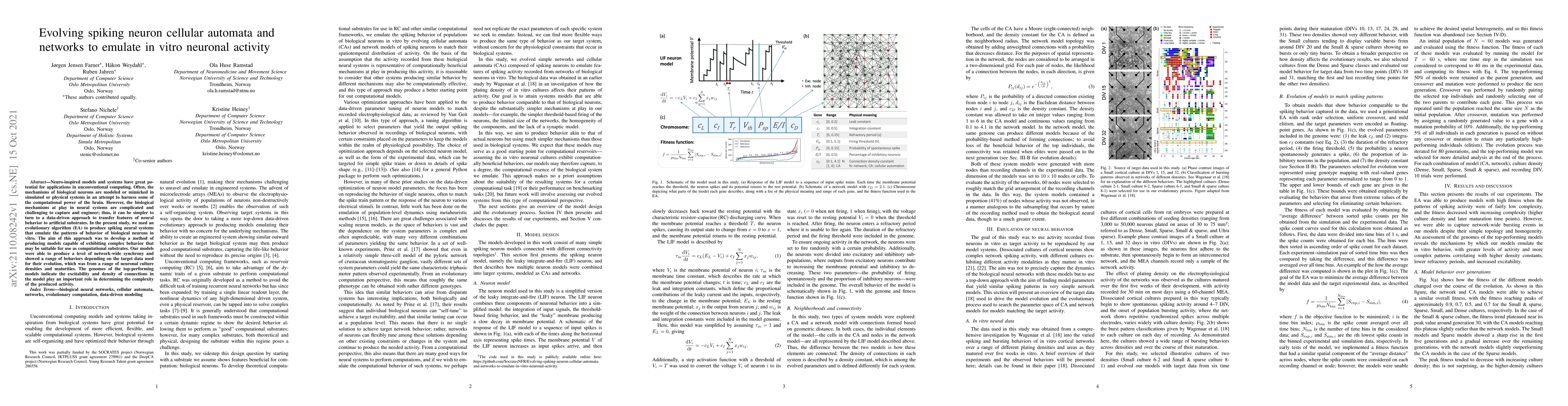 Neuro-inspired models and systems have great potential for applications in unconventional computing. Often, the mechanisms of biological neurons are modeled or mimicked in simulated or physical systems in an attempt to harness some of the computational power of the brain. However, the biological mechanisms at play in neural systems are complicated and challenging to capture and engineer; thus, it can be simpler to turn to a data-driven approach to transfer features of neural behavior to artificial substrates. In the present study, we used an evolutionary algorithm (EA) to produce spiking neural systems that emulate the patterns of behavior of biological neurons in vitro. The aim of this approach was to develop a method of producing models capable of exhibiting complex behavior that may be suitable for use as computational substrates. Our models were able to produce a level of network-wide synchrony and showed a range of behaviors depending on the target data used for their evolution, which was from a range of neuronal culture densities and maturities. The genomes of the top-performing models indicate the excitability and density of connections in the model play an important role in determining the complexity of the produced activity.