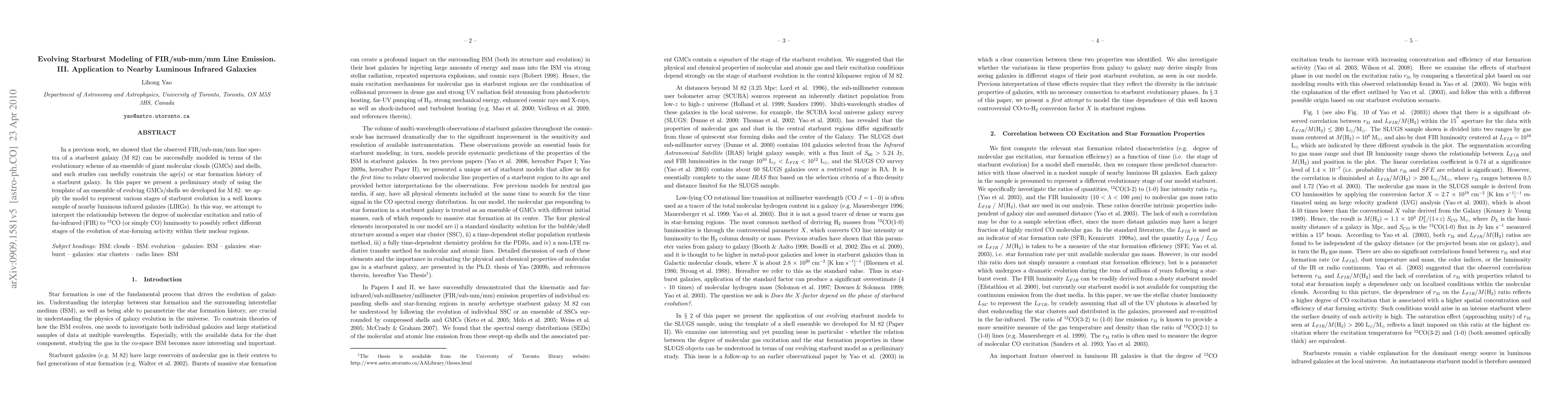 In a previous work, we showed that the observed FIR/sub-mm/mm line spectra of a starburst galaxy (M 82) can be successfully modeled in terms of the evolutionary scheme of an ensemble of giant molecular clouds (GMCs) and shells, and such studies can usefully constrain the age(s) or star formation history of a starburst galaxy. In this paper we present a preliminary study of using the template of an ensemble of evolving GMCs/shells we developed for M 82. we apply the model to represent various stages of starburst evolution in a well known sample of nearby luminous infrared galaxies (LIRGs). In this way, we attempt to interpret the relationship between the degree of molecular excitation and ratio of far-infrared (FIR) to $^{12}$CO (or simply CO) luminosity to possibly reflect different stages of the evolution of star-forming activity within their nuclear regions.