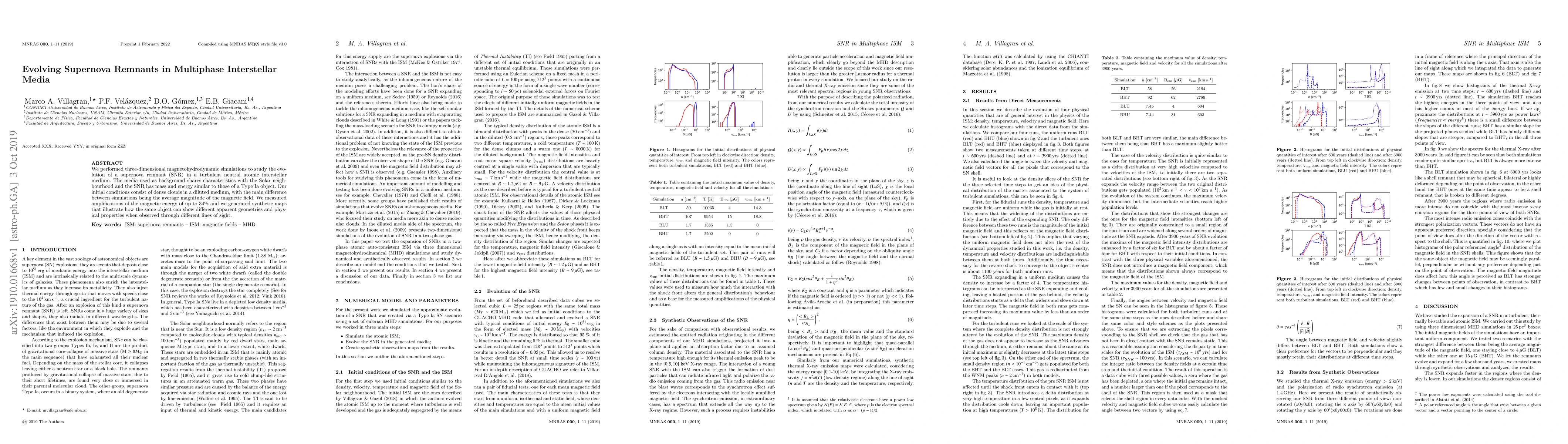 We performed three-dimensional magnetohydrodynamic simulations to study the evolution of a supernova remnant (SNR) in a turbulent neutral atomic interstellar medium. The media used as background shares characteristics with the Solar neighbourhood and the SNR has mass and energy similar to those of a Type Ia object. Our initial conditions consist of dense clouds in a diluted medium, with the main difference between simulations being the average magnitude of the magnetic field. We measured amplifications of the magnetic energy of up to 34$\%$ and we generated synthetic maps that illustrate how the same object can show different apparent geometries and physical properties when observed through different lines of sight.