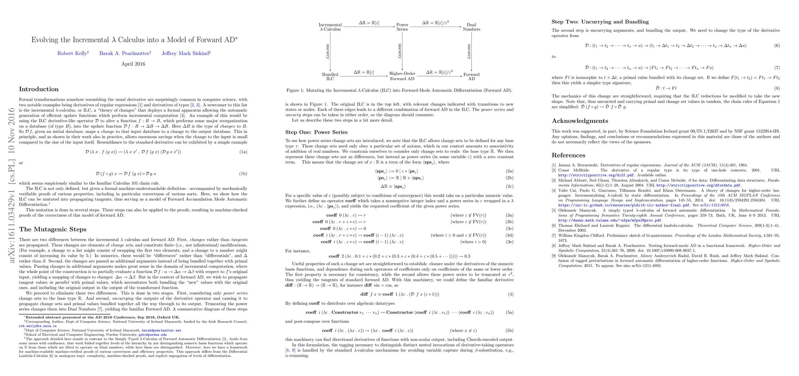 Formal transformations somehow resembling the usual derivative are surprisingly common in computer science, with two notable examples being derivatives of regular expressions and derivatives of types. A newcomer to this list is the incremental $\lambda$-calculus, or ILC, a "theory of changes" that deploys a formal apparatus allowing the automatic generation of efficient update functions which perform incremental computation. The ILC is not only defined, but given a formal machine-understandable definition---accompanied by mechanically verifiable proofs of various properties, including in particular correctness of various sorts. Here, we show how the ILC can be mutated into propagating tangents, thus serving as a model of Forward Accumulation Mode Automatic Differentiation. This mutation is done in several steps. These steps can also be applied to the proofs, resulting in machine-checked proofs of the correctness of this model of forward AD.