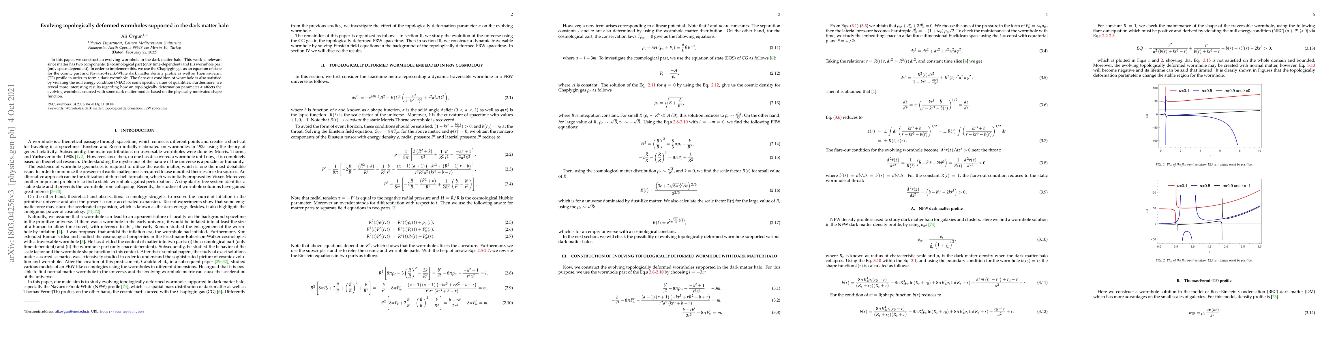 In this paper, we construct an evolving wormhole in the dark matter halo. This work is relevant since matter has two components: (i) cosmological part (only time-dependent) and (ii) wormhole part (only space-dependent). In order to implement this, we use the Chaplygin gas as an equation of state for the cosmic part and Navarro-Frenk-White dark matter density profile as well as Thomas-Fermi (TF) profile in order to form a dark wormhole. The flare-out condition of wormhole is also satisfied by violating the null energy condition (NEC) for some specific values of quantities. Furthermore, we reveal more interesting results regarding how an topologically deformation parameter $\alpha$ affects the evolving wormhole sourced with some dark matter models based on the physically motivated shape function.