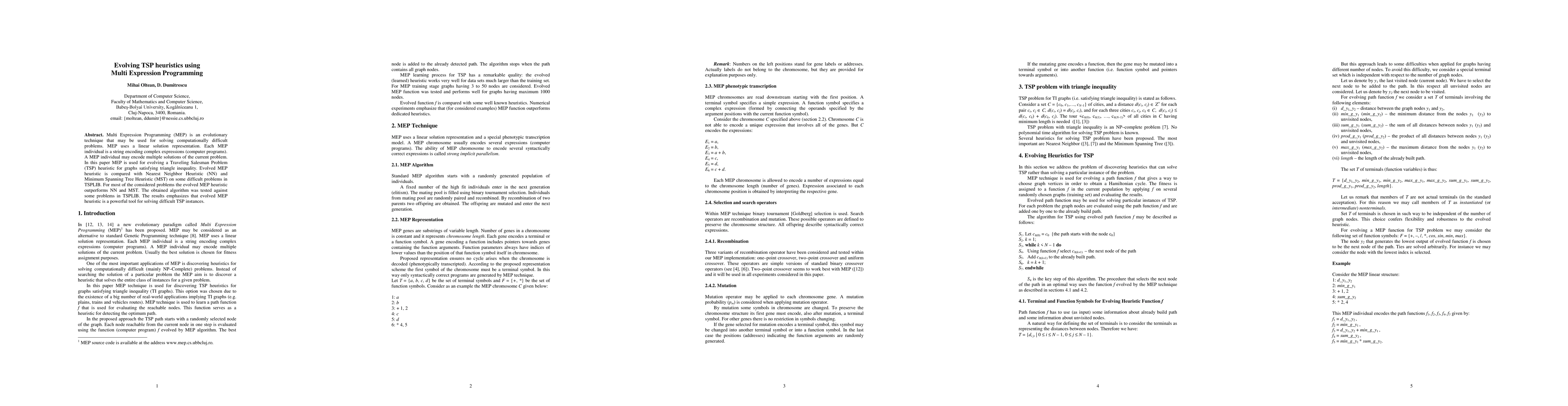 This paper explores using Multi Expression Programming (MEP) to evolve a heuristic for the Traveling Salesman Problem (TSP), demonstrating superior performance compared to Nearest Neighbor and Minimum Spanning Tree heuristics on challenging TSPLIB problems. The results suggest MEP is an effective approach for solving difficult TSP instances.