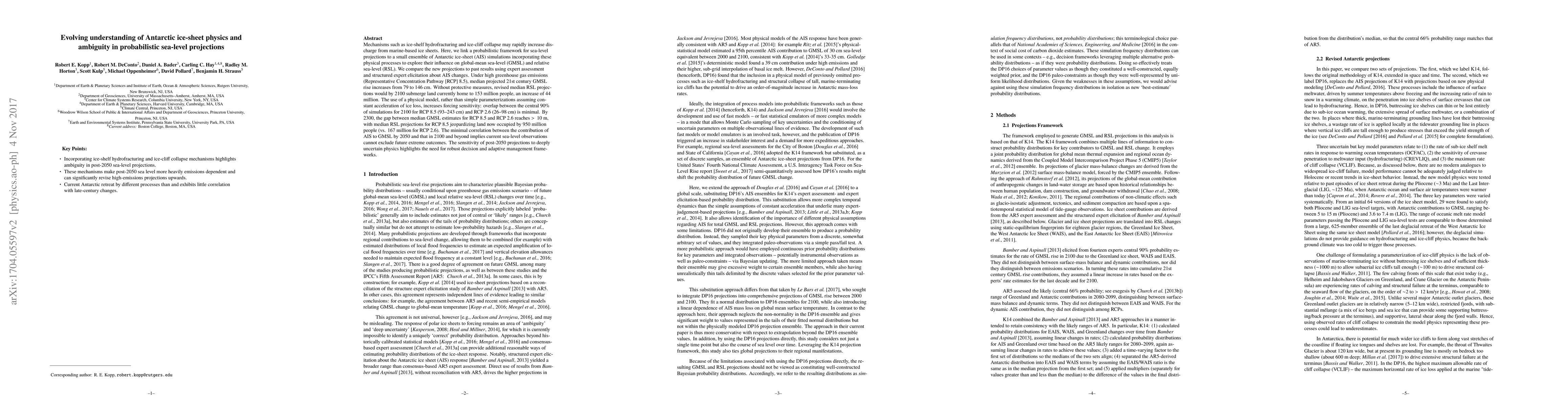 This research connects Antarctic ice-sheet dynamics to probabilistic sea-level projections, showing that mechanisms like hydrofracturing and ice-cliff collapse significantly boost sea-level rise. Under high emissions, projected 21st-century sea levels rise by 146 cm, affecting 153 million people; by 2300, this rises to over 10 m, impacting 950 million people. Current sea-level observations lack predictive power for extreme future outcomes, underscoring the need for adaptive management strategies.