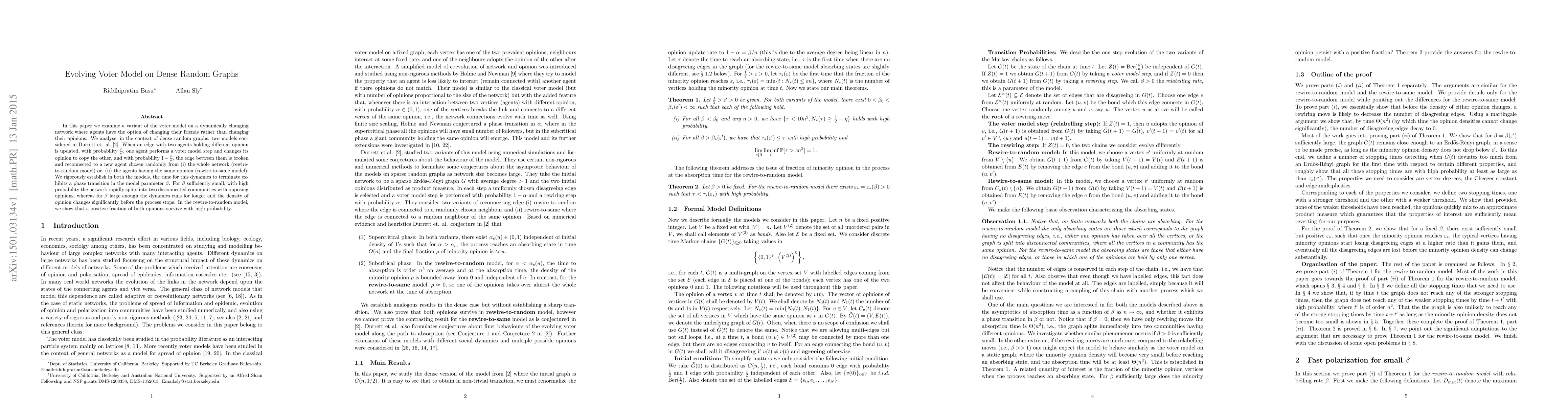 In this paper we examine a variant of the voter model on a dynamically changing network where agents have the option of changing their friends rather than changing their opinions. We analyse, in the context of dense random graphs, two models considered in Durrett et. al.(Proc. Natl. Acad. Sci. 109: 3682-3687, 2012). When an edge with two agents holding different opinion is updated, with probability $\frac{\beta}{n}$, one agent performs a voter model step and changes its opinion to copy the other, and with probability $1-\frac{\beta}{n}$, the edge between them is broken and reconnected to a new agent chosen randomly from (i) the whole network (rewire-to-random model) or, (ii) the agents having the same opinion (rewire-to-same model). We rigorously establish in both the models, the time for this dynamics to terminate exhibits a phase transition in the model parameter $\beta$. For $\beta$ sufficiently small, with high probability the network rapidly splits into two disconnected communities with opposing opinions, whereas for $\beta$ large enough the dynamics runs for longer and the density of opinion changes significantly before the process stops. In the rewire-to-random model, we show that a positive fraction of both opinions survive with high probability.