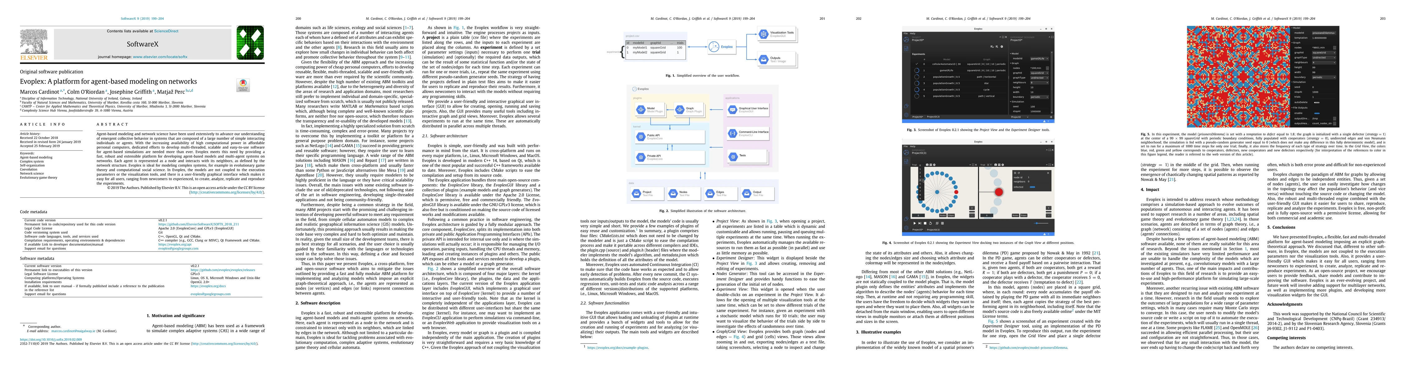 Agent-based modeling and network science have been used extensively to advance our understanding of emergent collective behavior in systems that are composed of a large number of simple interacting individuals or agents. With the increasing availability of high computational power in affordable personal computers, dedicated efforts to develop multi-threaded, scalable and easy-to-use software for agent-based simulations are needed more than ever. Evoplex meets this need by providing a fast, robust and extensible platform for developing agent-based models and multi-agent systems on networks. Each agent is represented as a node and interacts with its neighbors, as defined by the network structure. Evoplex is ideal for modeling complex systems, for example in evolutionary game theory and computational social science. In Evoplex, the models are not coupled to the execution parameters or the visualization tools, and there is a user-friendly graphical interface which makes it easy for all users, ranging from newcomers to experienced, to create, analyze, replicate and reproduce the experiments.