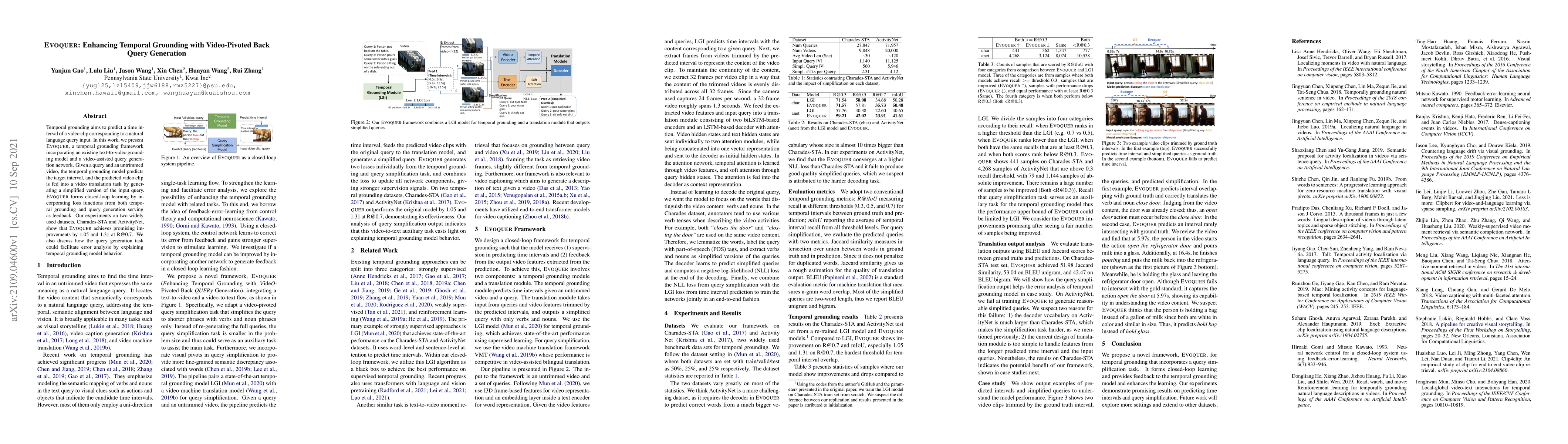 Temporal grounding aims to predict a time interval of a video clip corresponding to a natural language query input. In this work, we present EVOQUER, a temporal grounding framework incorporating an existing text-to-video grounding model and a video-assisted query generation network. Given a query and an untrimmed video, the temporal grounding model predicts the target interval, and the predicted video clip is fed into a video translation task by generating a simplified version of the input query. EVOQUER forms closed-loop learning by incorporating loss functions from both temporal grounding and query generation serving as feedback. Our experiments on two widely used datasets, Charades-STA and ActivityNet, show that EVOQUER achieves promising improvements by 1.05 and 1.31 at [email protected]. We also discuss how the query generation task could facilitate error analysis by explaining temporal grounding model behavior.