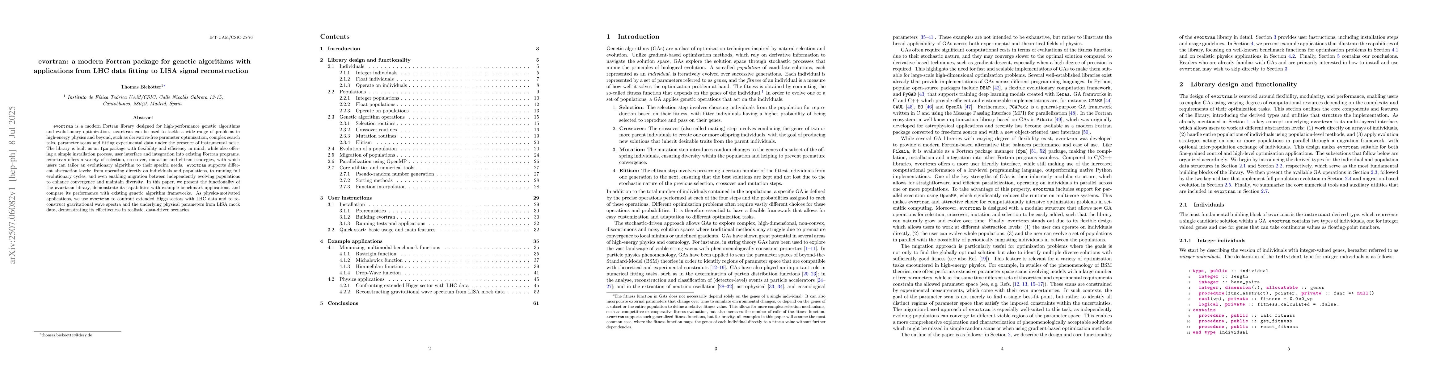 evortran is a modern Fortran library designed for high-performance genetic algorithms and evolutionary optimization. evortran can be used to tackle a wide range of problems in high-energy physics and beyond, such as derivative-free parameter optimization, complex search taks, parameter scans and fitting experimental data under the presence of instrumental noise. The library is built as an fpm package with flexibility and efficiency in mind, while also offering a simple installation process, user interface and integration into existing Fortran programs. evortran offers a variety of selection, crossover, mutation and elitism strategies, with which users can tailor an evolutionary algorithm to their specific needs. evortran supports different abstraction levels: from operating directly on individuals and populations, to running full evolutionary cycles, and even enabling migration between independently evolving populations to enhance convergence and maintain diversity. In this paper, we present the functionality of the evortran library, demonstrate its capabilities with example benchmark applications, and compare its performance with existing genetic algorithm frameworks. As physics-motivated applications, we use evortran to confront extended Higgs sectors with LHC data and to reconstruct gravitational wave spectra and the underlying physical parameters from LISA mock data, demonstrating its effectiveness in realistic, data-driven scenarios.