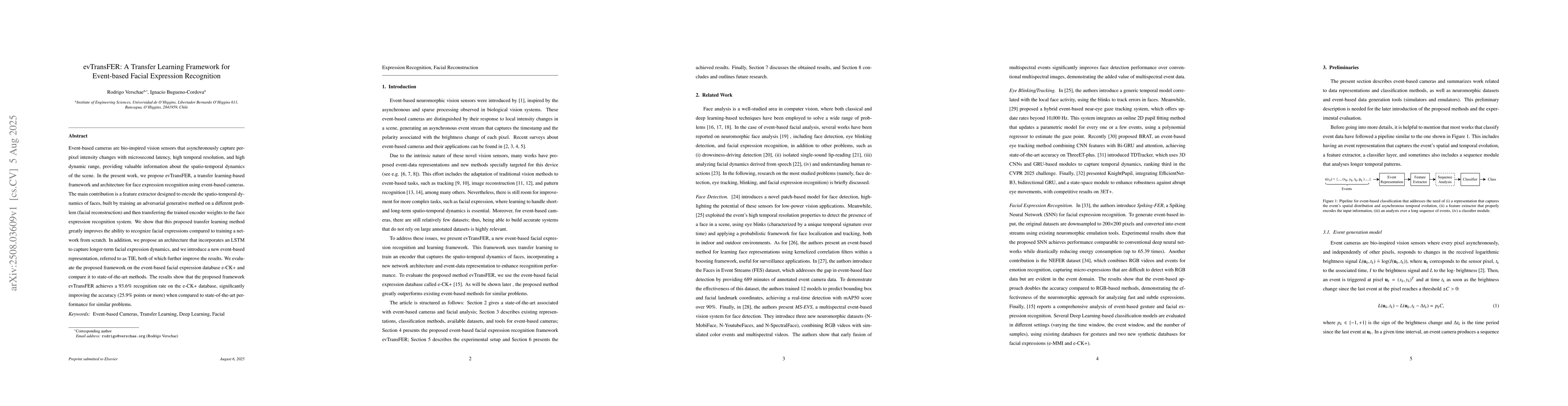 Event-based cameras are bio-inspired vision sensors that asynchronously capture per-pixel intensity changes with microsecond latency, high temporal resolution, and high dynamic range, providing valuable information about the spatio-temporal dynamics of the scene. In the present work, we propose evTransFER, a transfer learning-based framework and architecture for face expression recognition using event-based cameras. The main contribution is a feature extractor designed to encode the spatio-temporal dynamics of faces, built by training an adversarial generative method on a different problem (facial reconstruction) and then transferring the trained encoder weights to the face expression recognition system. We show that this proposed transfer learning method greatly improves the ability to recognize facial expressions compared to training a network from scratch. In addition, we propose an architecture that incorporates an LSTM to capture longer-term facial expression dynamics, and we introduce a new event-based representation, referred to as TIE, both of which further improve the results. We evaluate the proposed framework on the event-based facial expression database e-CK+ and compare it to state-of-the-art methods. The results show that the proposed framework evTransFER achieves a 93.6\% recognition rate on the e-CK+ database, significantly improving the accuracy (25.9\% points or more) when compared to state-of-the-art performance for similar problems.