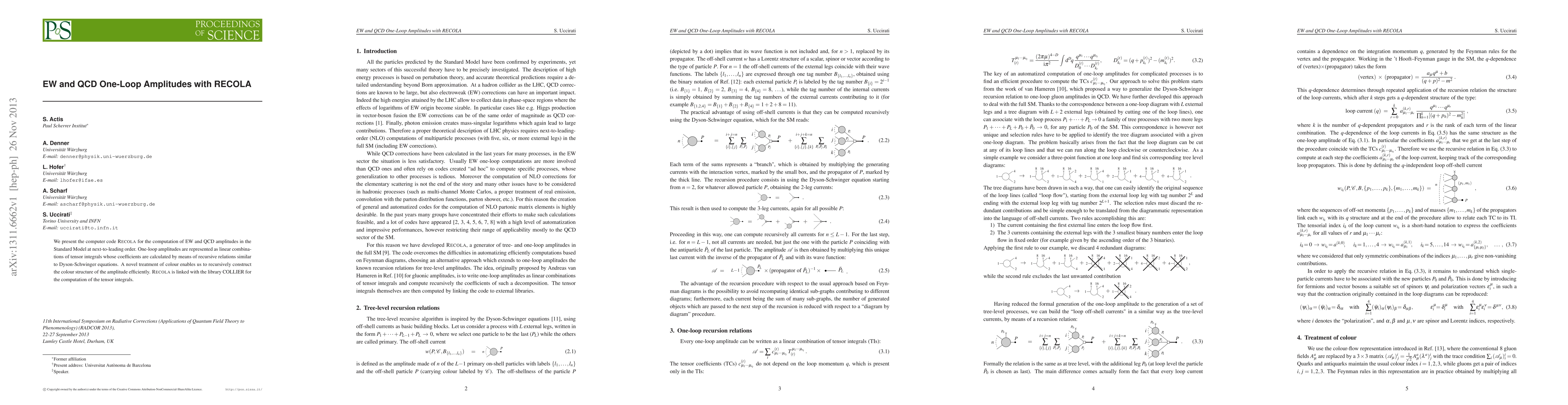 Summary: RECOLA is a computer code developed for calculating next-to-leading order amplitudes in EW and QCD processes, utilizing recursive relations for tensor integrals and a novel method for efficient colour structure computation, linked with the COLLIER library for tensor integral computation.