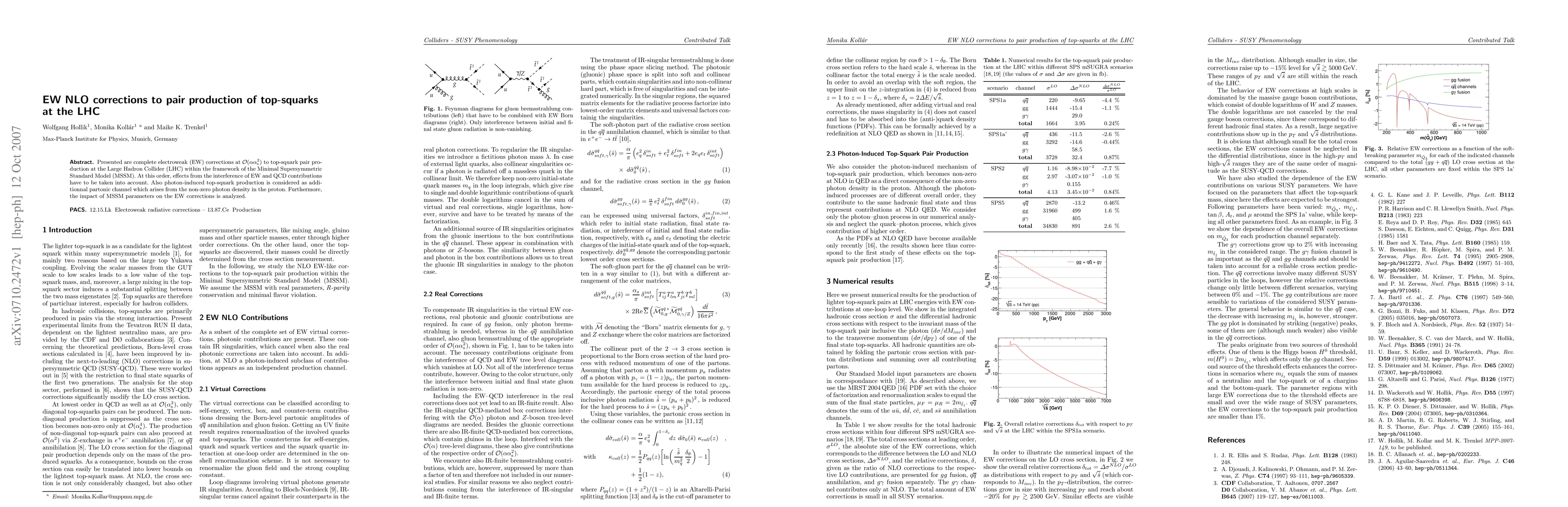 Presented are complete electroweak (EW) corrections at ${\cal O}(\alpha\alpha_{\mathrm s}^{\mathrm 2})$ to top-squark pair production at the Large Hadron Collider (LHC) within the framework of the Minimal Supersymmetric Standard Model (MSSM). At this order, effects from the interference of EW and QCD contributions have to be taken into account. Also photon-induced top-squark production is considered as additionnal partonic channel which arises from the non-zero photon density in the proton. Furthermore, the impact of MSSM parameters on the EW corrections is analyzed.