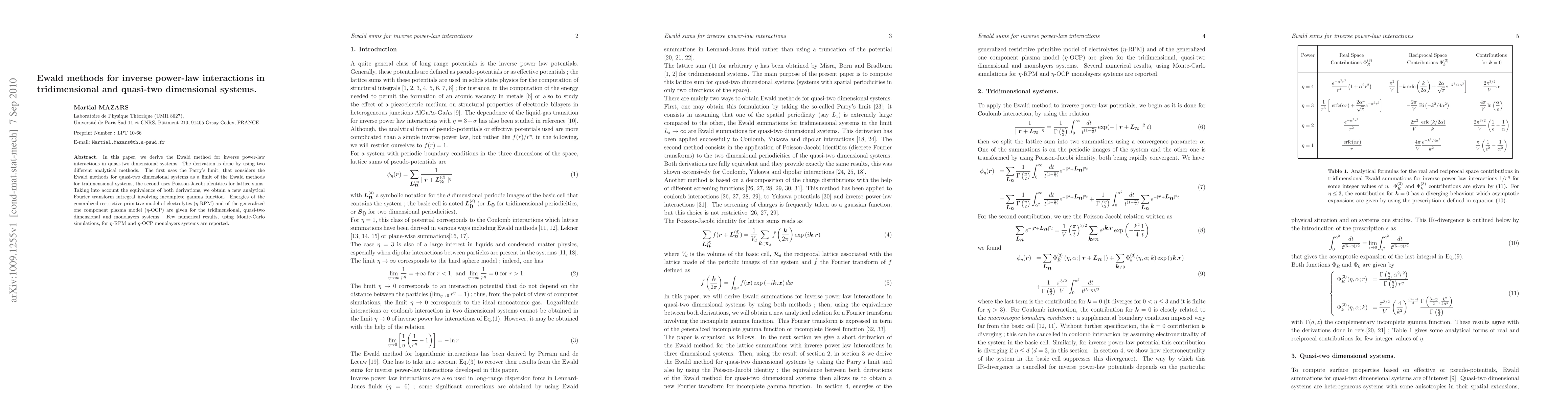 This paper derives the Ewald method for inverse power-law interactions in quasi-two dimensional systems using two analytical methods, leading to a new analytical Fourier transform integral. It also computes energies for generalized models of electrolytes and plasmas in tridimensional, quasi-two dimensional, and monolayer systems, with numerical results from Monte-Carlo simulations.
