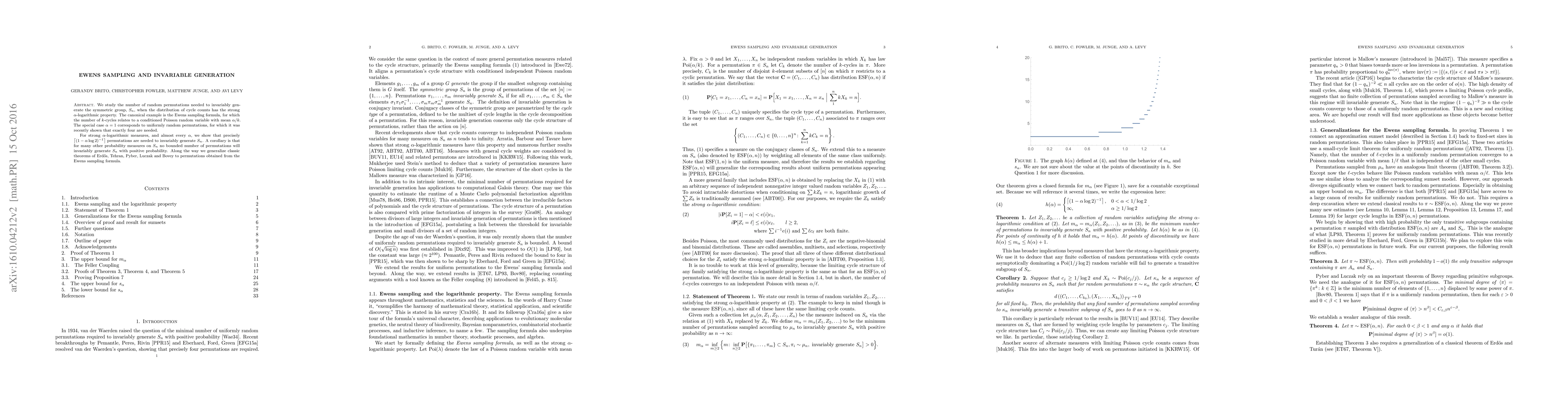The paper presents a detailed analysis of the Ewens sampling formula under strong $\alpha$-logarithmic conditions, leading to precise bounds on the number of permutations needed to invariably generate $S_n$.
