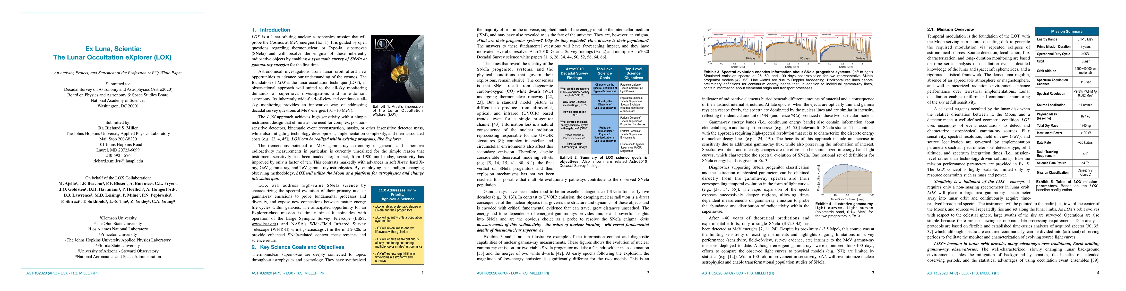 LOX is a lunar-orbiting astrophysics mission that will probe the cosmos at MeV energies. It is guided by open questions regarding thermonuclear, or Type-Ia, supernovae (SNeIa) and will characterize these inherently radioactive objects by enabling a systematic survey of SNeIa at gamma-ray energies for the first time. Astronomical investigations from lunar orbit afford new opportunities to advance our understanding of the cosmos. The foundation of LOX is an observational approach well suited to the all-sky monitoring demands of supernova investigations and time-domain astronomy. Its inherently wide field-of-view and continuous all-sky monitoring provides an innovative way of addressing decadal survey questions at MeV energies (0.1-10 MeV). The LOX approach achieves high sensitivity with a simple, high-heritage instrument design that eliminates the need for complex, position-sensitive detectors, kinematic event reconstruction, masks, or other insensitive detector mass, while also mitigating technology development, implementation complexity, and their associated costs. LOX can be realized within existing programs, like Explorer.