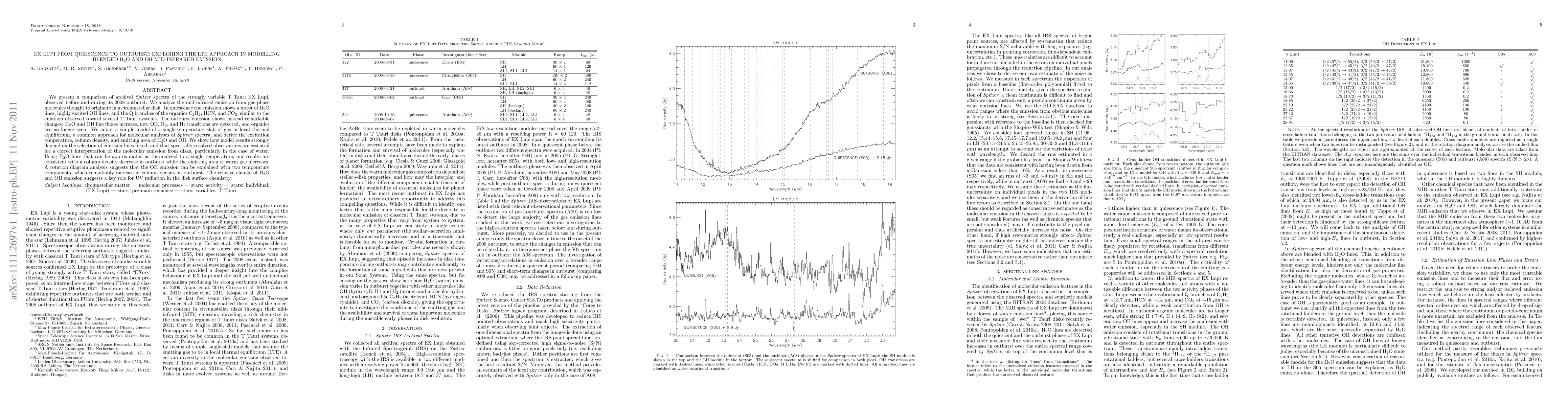 This paper compares Spitzer spectra of the T Tauri star EX Lupi before and during its 2008 outburst, revealing significant changes in mid-infrared emission from gas-phase molecules in its circumstellar disk. The study uses a local thermal equilibrium model to analyze H2O and OH lines, finding that UV radiation likely plays a crucial role in the disk's surface chemistry.