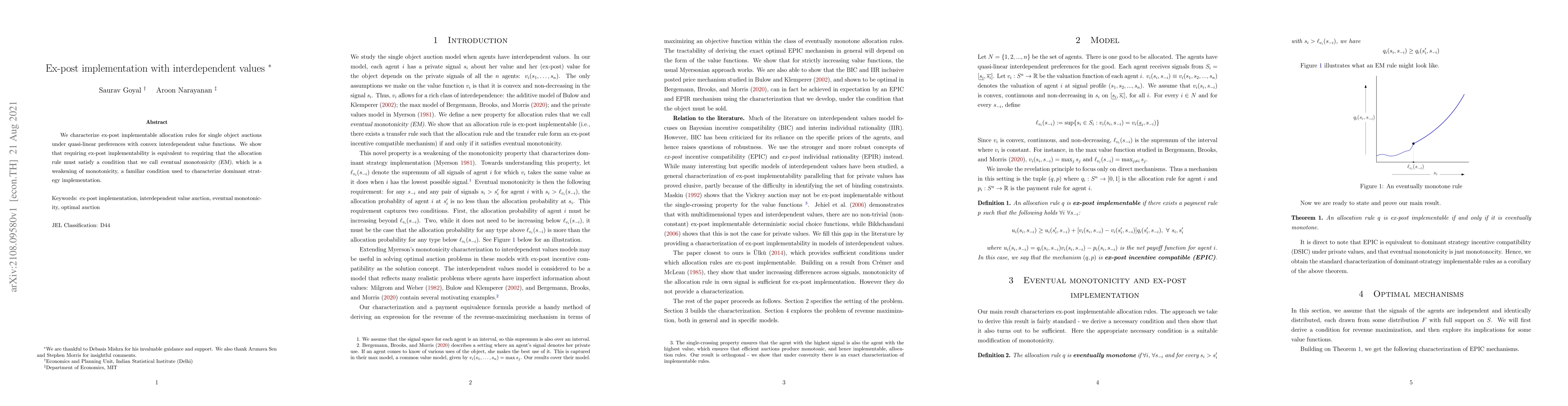 Researchers developed a condition called eventual monotonicity (EM) to characterize ex-post implementability in single object auctions with convex interdependent value functions. This condition is equivalent to requiring dominant strategy implementation.