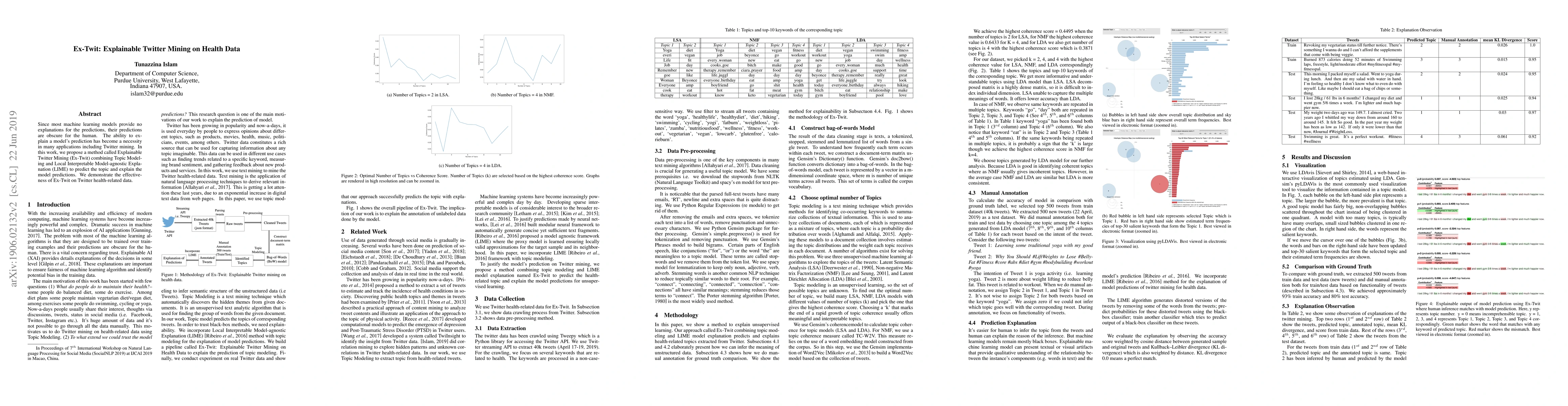This paper introduces Explainable Twitter Mining (Ex-Twit), a method that combines Topic Modeling and LIME to predict and explain health-related topics in Twitter data. The approach aims to provide interpretable insights into machine learning predictions, enhancing transparency and trust.