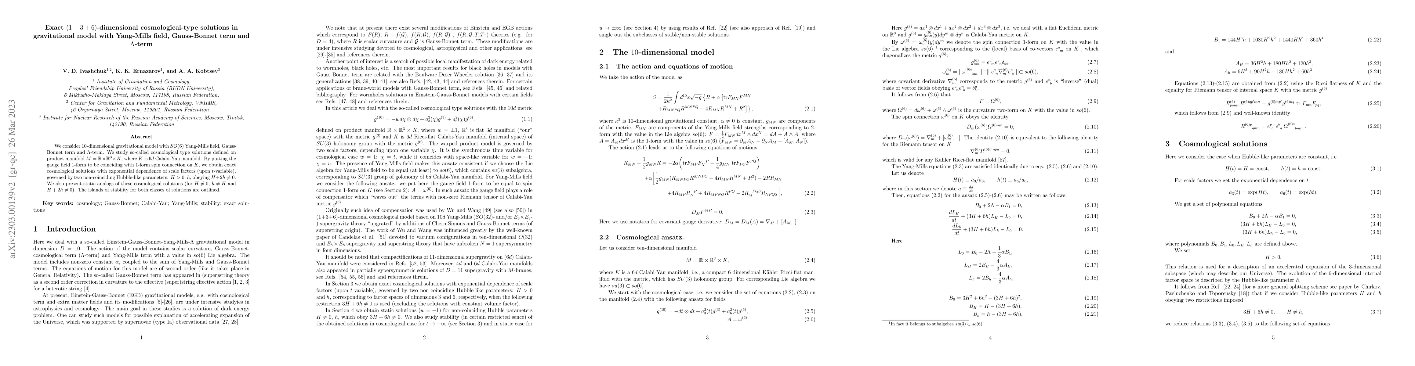 This paper explores exact $(1 + 3 + 6)$-dimensional cosmological solutions in a $10$-dimensional gravitational model incorporating $SO(6)$ Yang-Mills field, Gauss-Bonnet term, and $\Lambda$-term. It finds solutions with exponential scale factors governed by distinct Hubble-like parameters, and also presents static analogs, highlighting regions of stability.