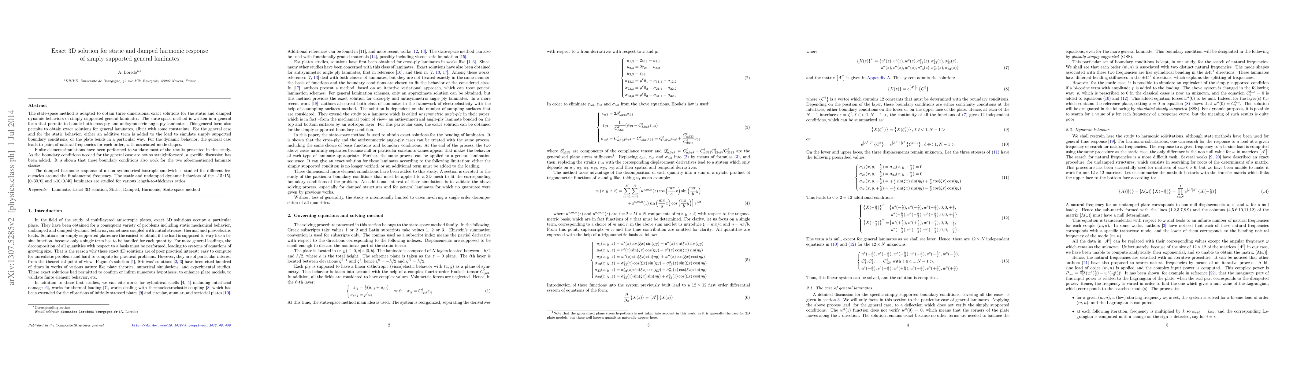 This study develops a three-dimensional exact solution for static and damped harmonic response of simply supported general laminates using the state-space method, providing insights into the behavior of various laminate classes.