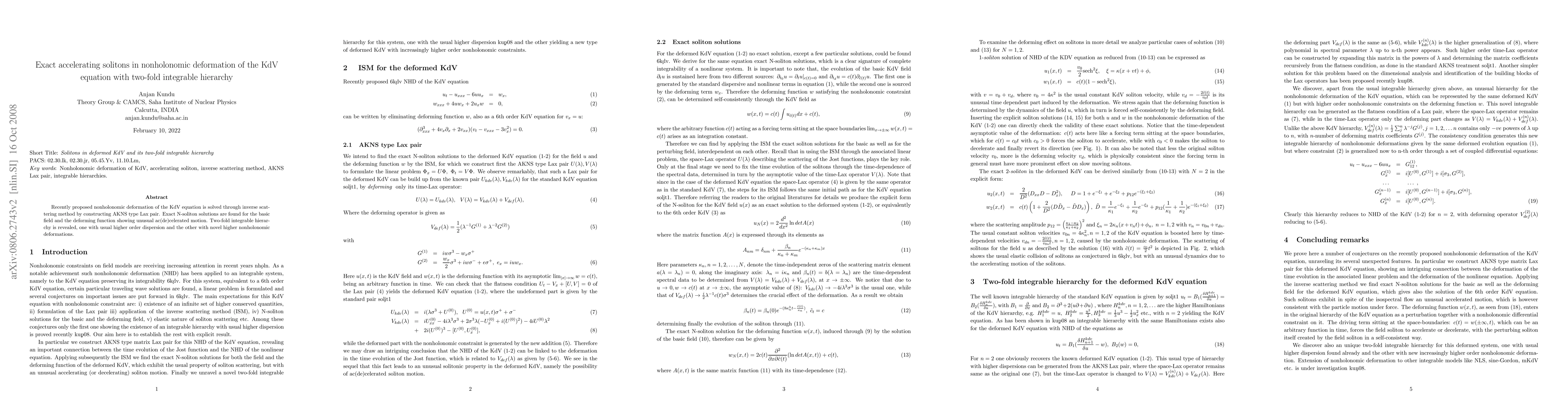 This paper solves the nonholonomic deformation of the KdV equation using the inverse scattering method, constructing an AKNS-type Lax pair to find exact N-soliton solutions with accelerated motion. It reveals a two-fold integrable hierarchy, distinguishing between traditional higher order dispersion and novel nonholonomic deformations.