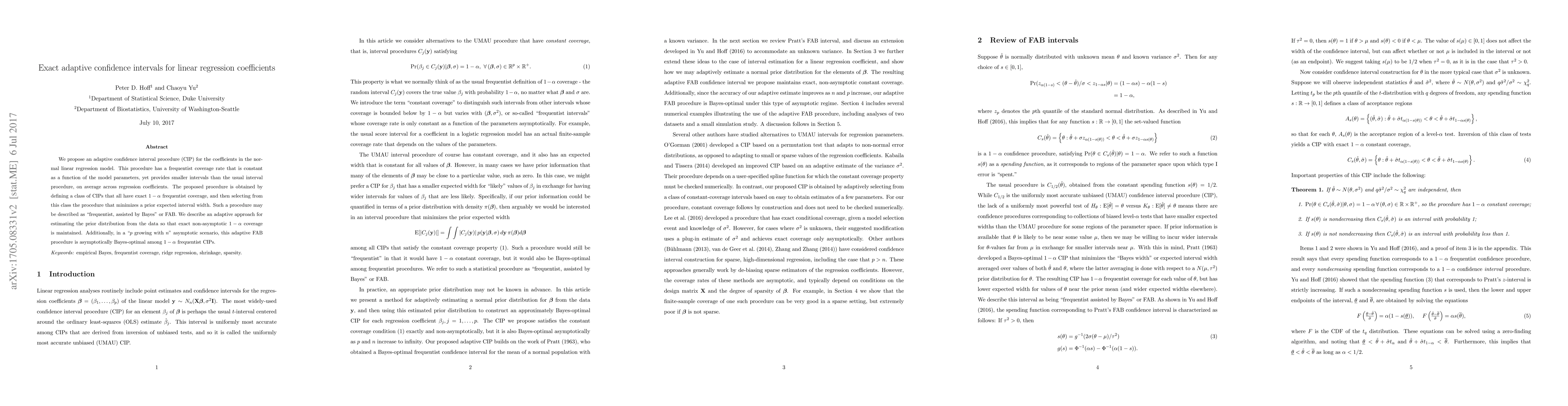 This paper introduces an adaptive confidence interval procedure (CIP) for linear regression coefficients that achieves exact frequentist coverage while providing smaller intervals compared to traditional methods. The proposed "frequentist, assisted by Bayes" (FAB) procedure selects the optimal interval width based on prior data, maintaining exact coverage and demonstrating asymptotic optimality in high-dimensional settings.