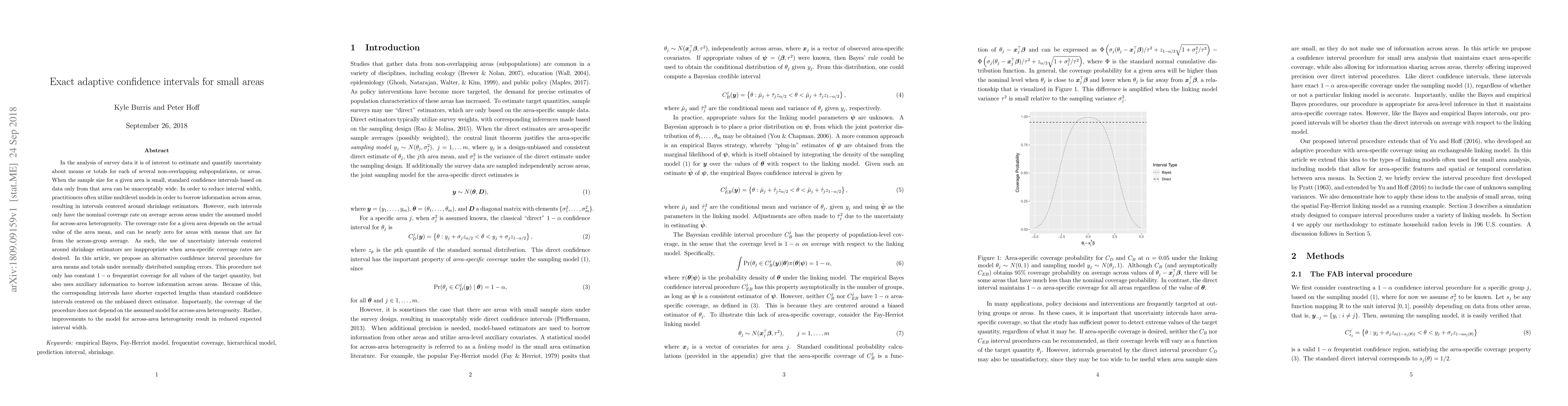 New confidence interval method provides constant $1-eta$ coverage for area means with shorter expected lengths than standard intervals, without relying on assumed models for across-area heterogeneity.