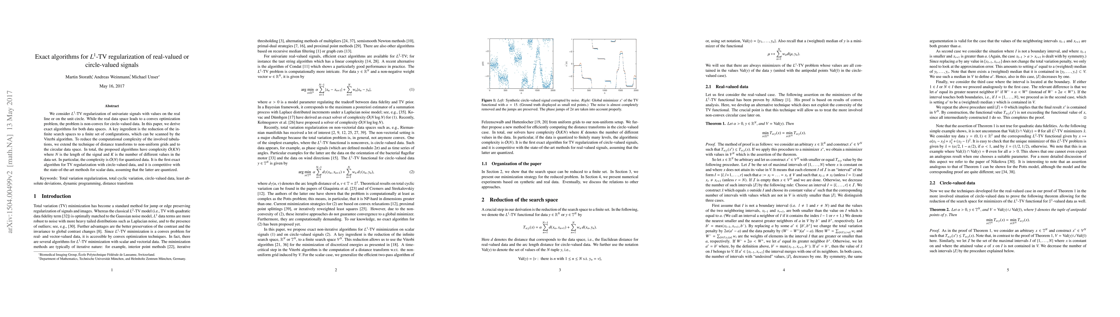 This paper presents exact algorithms for $L^1$-TV regularization of real-valued or circle-valued signals, utilizing a Viterbi algorithm to efficiently handle both convex and non-convex optimization problems. The approach reduces infinite search spaces to finite sets, achieving $\mathscr{O}(KN)$ complexity, with $\mathscr{O}(N)$ for quantized data.