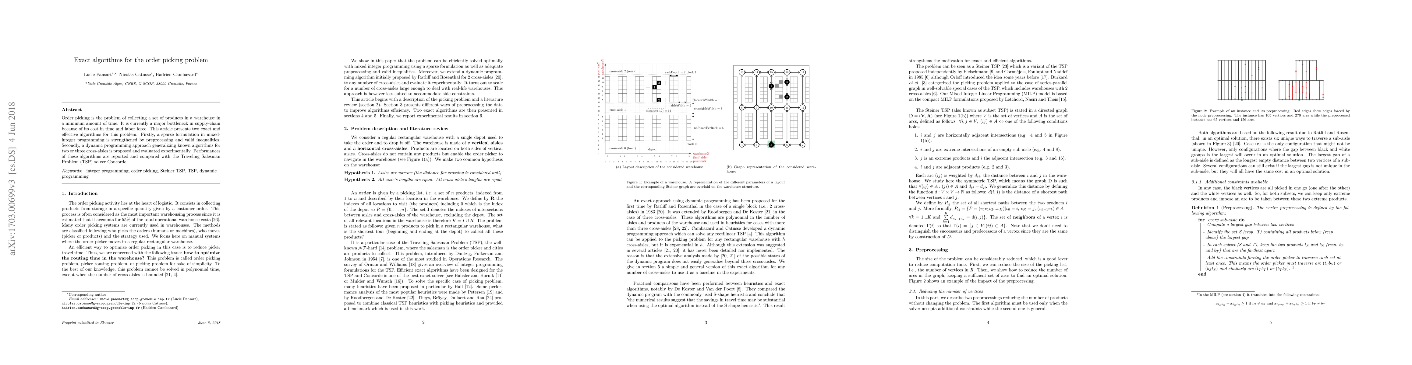 This paper introduces two exact algorithms for the order picking problem in warehouses, aiming to minimize time and labor costs. The first uses a strengthened sparse mixed-integer programming approach, while the second employs a dynamic programming method. Experimental results compare their performance against the TSP solver Concorde.
