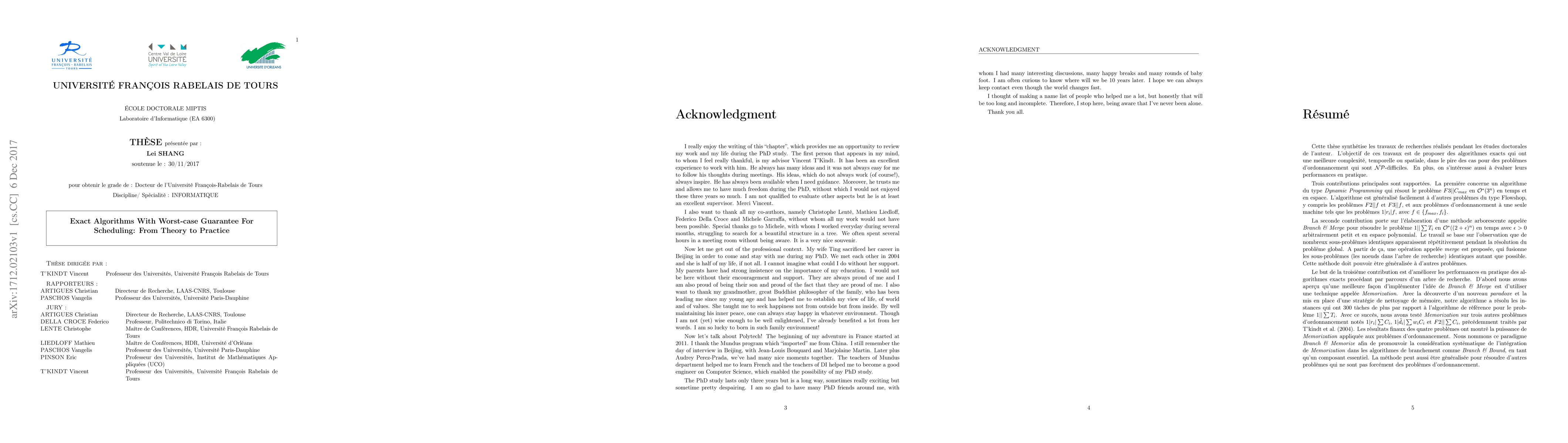 This PhD thesis explores exact algorithms for NP-hard scheduling problems, providing worst-case guarantees. Key contributions include a Dynamic Programming algorithm for F3Cmax, a Branch & Merge method for 1||SumTi, and the introduction of Memorization to enhance practical efficiency, notably solving more instances of scheduling problems than existing methods.