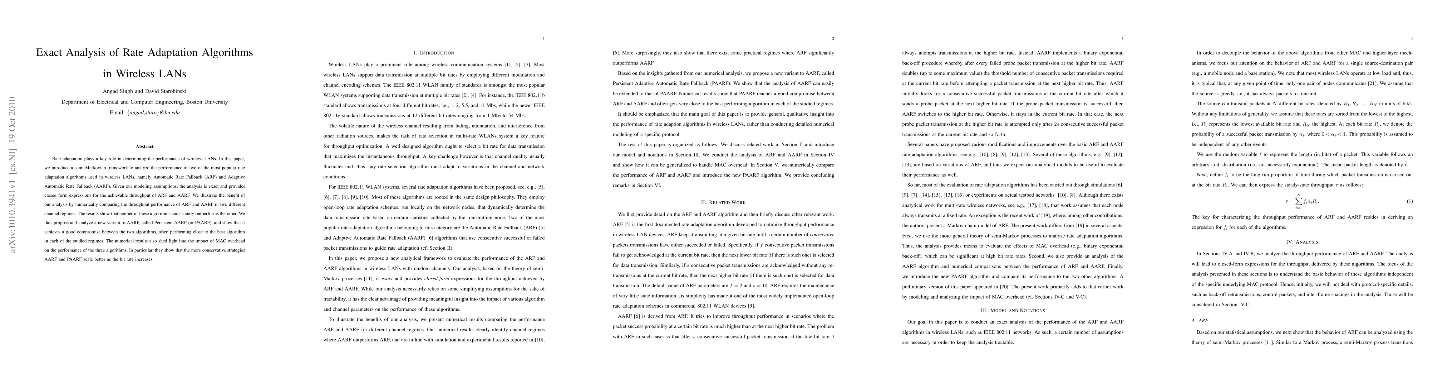 This paper introduces a semi-Markovian framework to precisely analyze the performance of ARF and AARF rate adaptation algorithms in wireless LANs, deriving exact closed-form throughput expressions. It finds that neither consistently outperforms the other, leading to the proposal of a new variant, PAARF, which often performs close to the best in different channel conditions.