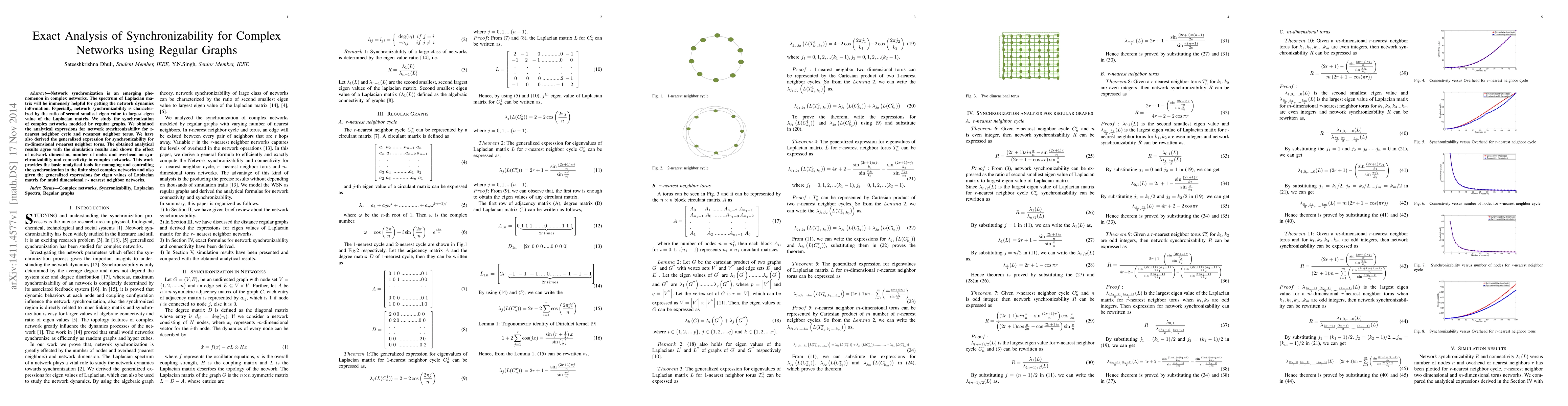 Network synchronization is an emerging phenomenon in complex networks. The spectrum of Laplacian matrix will be immensely helpful for getting the network dynamics information. Especially, network synchronizability is characterized by the ratio of second smallest eigen value to largest eigen value of the Laplacian matrix. We study the synchronization of complex networks modeled by regular graphs. We obtained the analytical expressions for network synchronizability for r-nearest neighbor cycle and r-nearest neighbor torus. We have also derived the generalized expression for synchronizability for m-dimensional r-nearest neigh- bor torus. The obtained analytical results agree with the simulation results and shown the effect of network dimension, number of nodes and overhead on syn- chronizability and connectivity in complex networks. This work provides the basic analytical tools for managing and controlling the synchronization in the fi- nite sized complex networks and also given the generalized expressions for eigen values of Laplacian matrix for multi dimensional r- nearest neighbor networks.