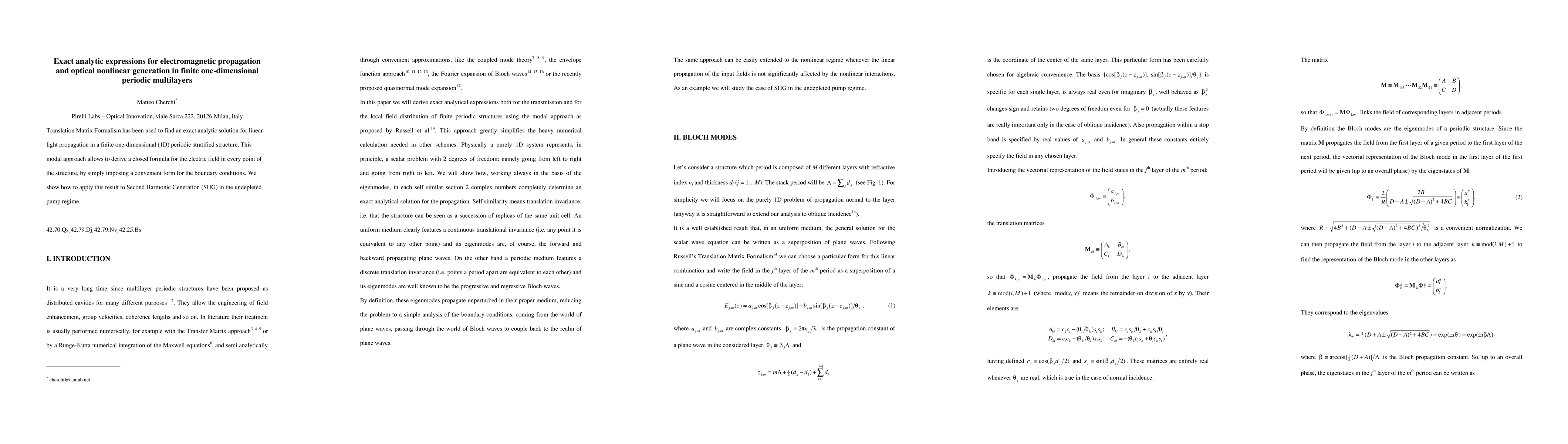 Translation Matrix Formalism has been used to find an exact analytic solution for linear light propagation in a finite one-dimensional (1D) periodic stratified structure. This modal approach allows to derive a closed formula for the electric field in every point of the structure, by simply imposing a convenient form for the boundary conditions. We show how to apply this result to Second Harmonic Generation (SHG) in the undepleted pump regime.
