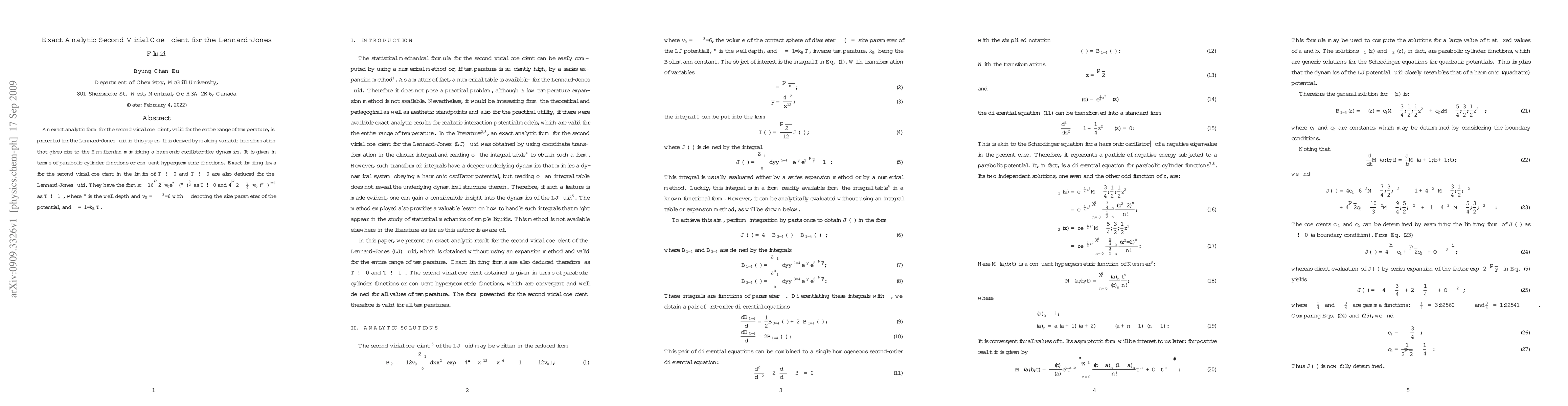 This paper presents an exact analytic expression for the second virial coefficient of the Lennard-Jones fluid across all temperatures, derived through a variable transformation that approximates harmonic oscillator dynamics. The result is expressed using parabolic cylinder or confluent hypergeometric functions, with exact limits for low and high temperatures also provided.