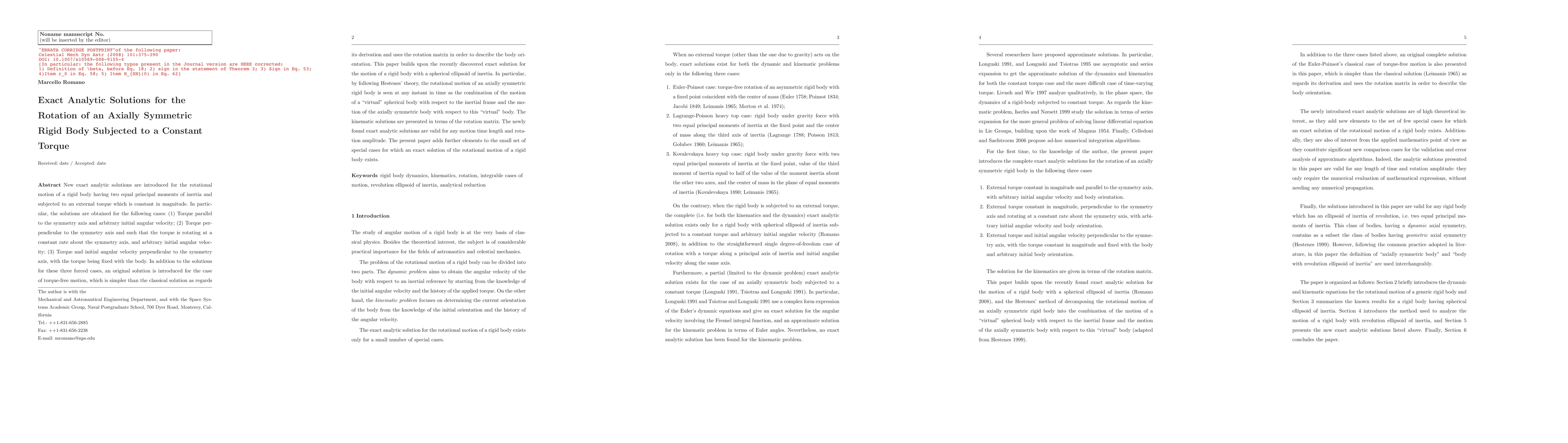This paper presents new exact analytic solutions for the rotational motion of an axially symmetric rigid body under constant torque, including cases where the torque is parallel or perpendicular to the symmetry axis and the torque-free motion. The solutions utilize the rotation matrix and build on Hestenes' theory, providing a comprehensive view of the body's orientation and motion over any time length.