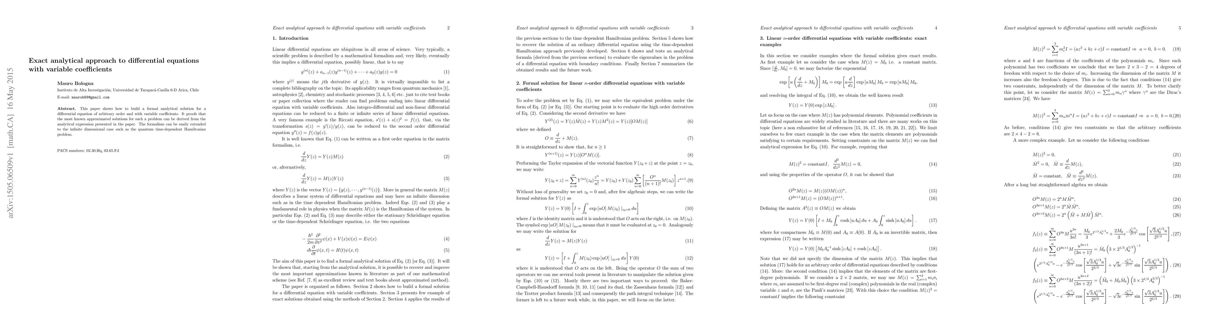 This paper presents an exact analytical method for solving differential equations of any order with variable coefficients, demonstrating that known approximate solutions can be derived from the proposed analytical expression. The formalism is extendable to infinite-dimensional cases, including quantum time-dependent Hamiltonian problems.