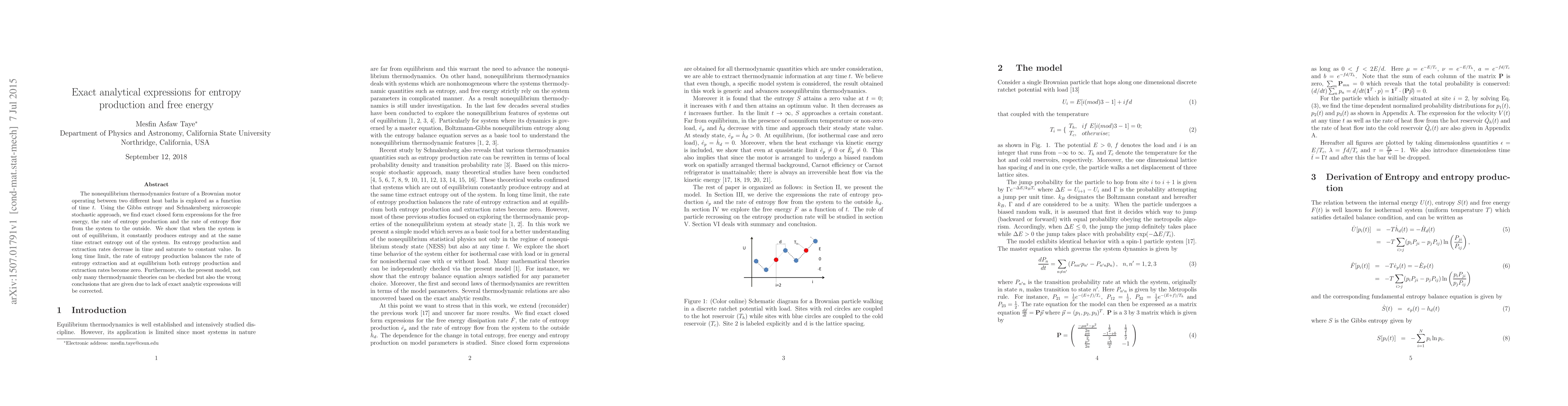 The nonequilibrium thermodynamics feature of a Brownian motor operating between two different heat baths is explored as a function of time $t$. Using the Gibbs entropy and Schnakenberg microscopic stochastic approach, we find exact closed form expressions for the free energy, the rate of entropy production and the rate of entropy flow from the system to the outside. We show that when the system is out of equilibrium, it constantly produces entropy and at the same time extract entropy out of the system. Its entropy production and extraction rates decrease in time and saturate to constant value. In long time limit, the rate of entropy production balances the rate of entropy extraction and at equilibrium both entropy production and extraction rates become zero. Furthermore, via the present model, not only many thermodynamic theories can be checked but also the wrong conclusions that are given due to lack of exact analytic expressions will be corrected.