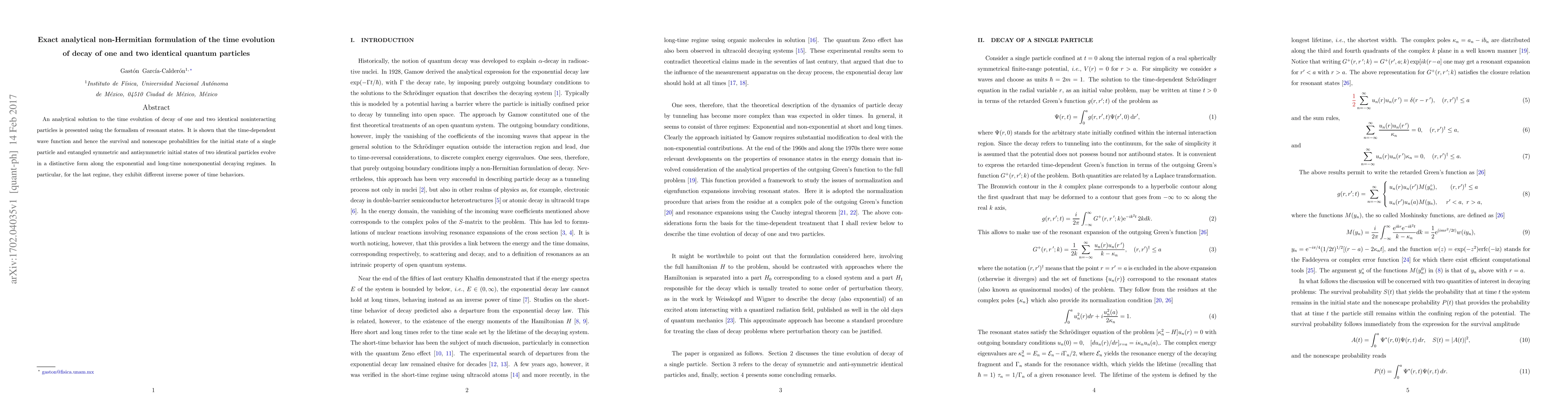 This paper presents an exact analytical non-Hermitian formulation for the time evolution of decay in one and two identical quantum particles, revealing distinctive exponential and long-time nonexponential decay behaviors, with the latter showing different inverse power of time dependencies.