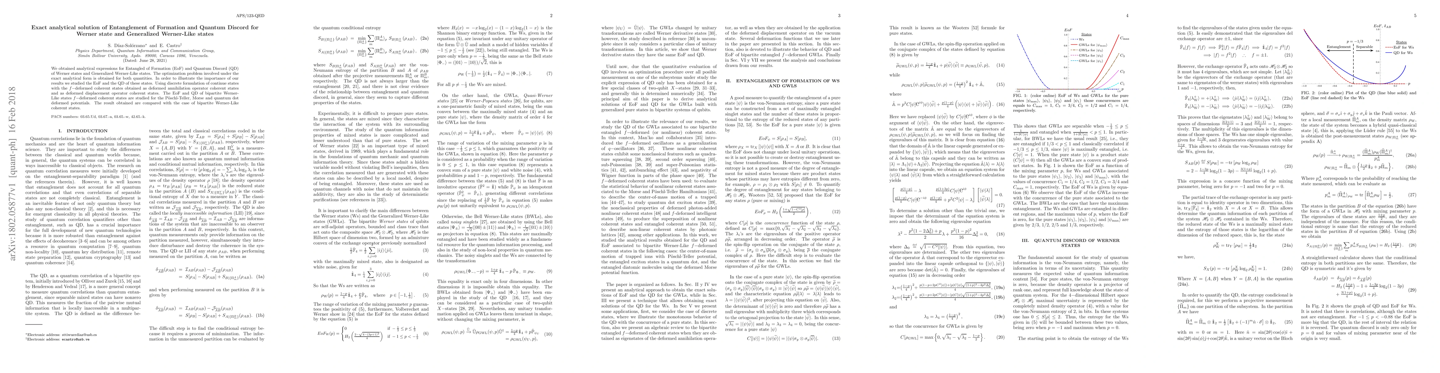 This paper provides exact analytical expressions for the Entanglement of Formation and Quantum Discord of Werner states and Generalized Werner-Like states, solving the associated optimization problem. It also explores these quantities for $f-$deformed coherent states under P\"{o}schl-Teller, Morse, and quantum dot potentials, comparing results with standard bipartite Werner-Like coherent states.