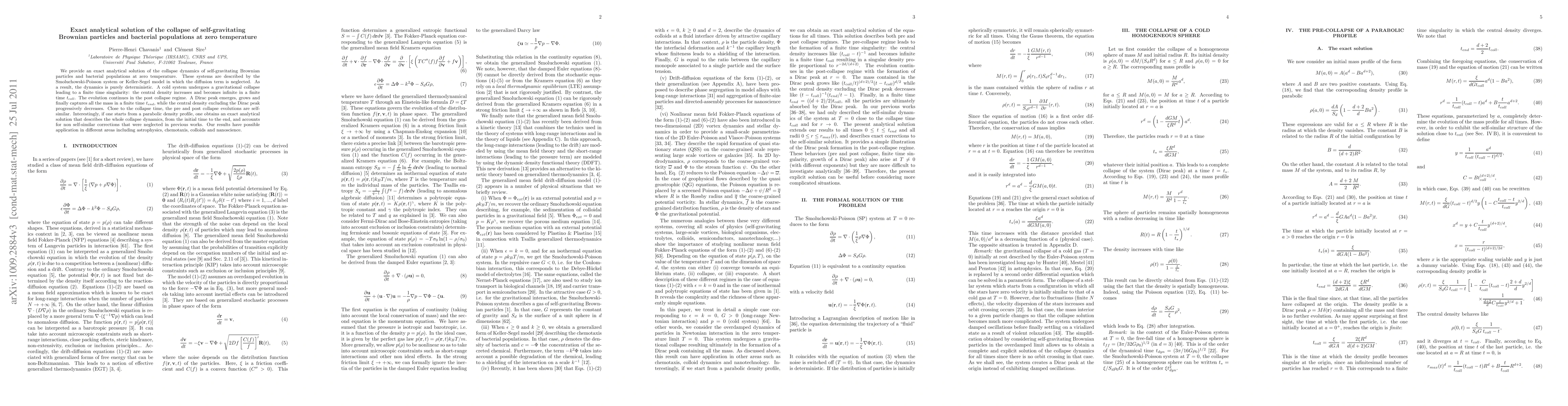 This paper presents an exact analytical solution for the collapse dynamics of self-gravitating Brownian particles and bacterial populations at zero temperature, revealing a finite time singularity and the emergence of a Dirac peak capturing all mass in a finite time. The solution accounts for non-self-similar corrections and has implications for astrophysics, chemotaxis, colloids, and nanoscience.