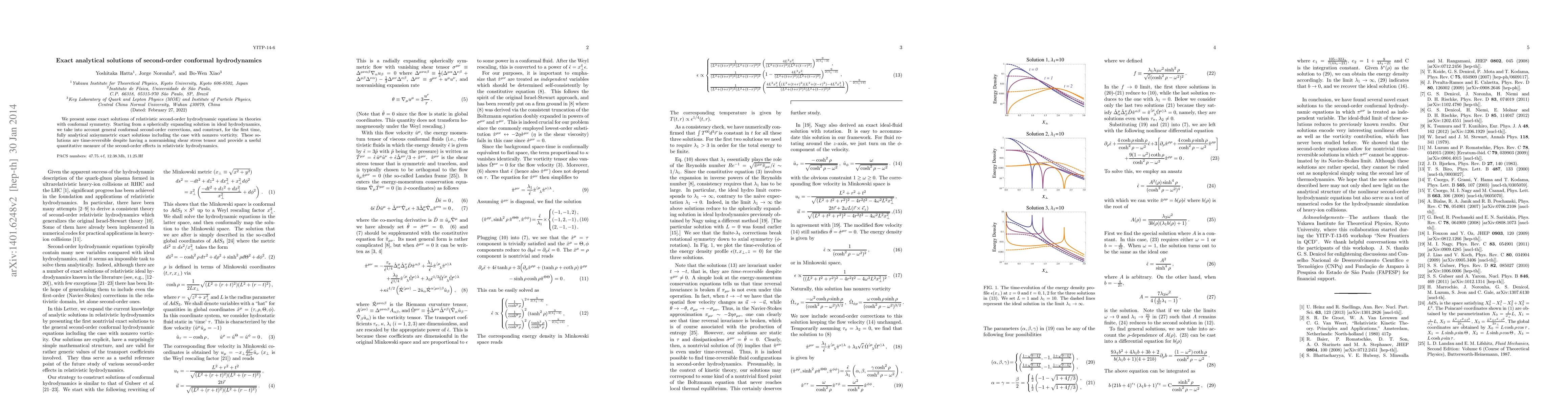 The paper presents novel exact analytical solutions for second-order conformal hydrodynamics, including nonzero vorticity, which are time-reversible despite having nonvanishing shear stress tensors.