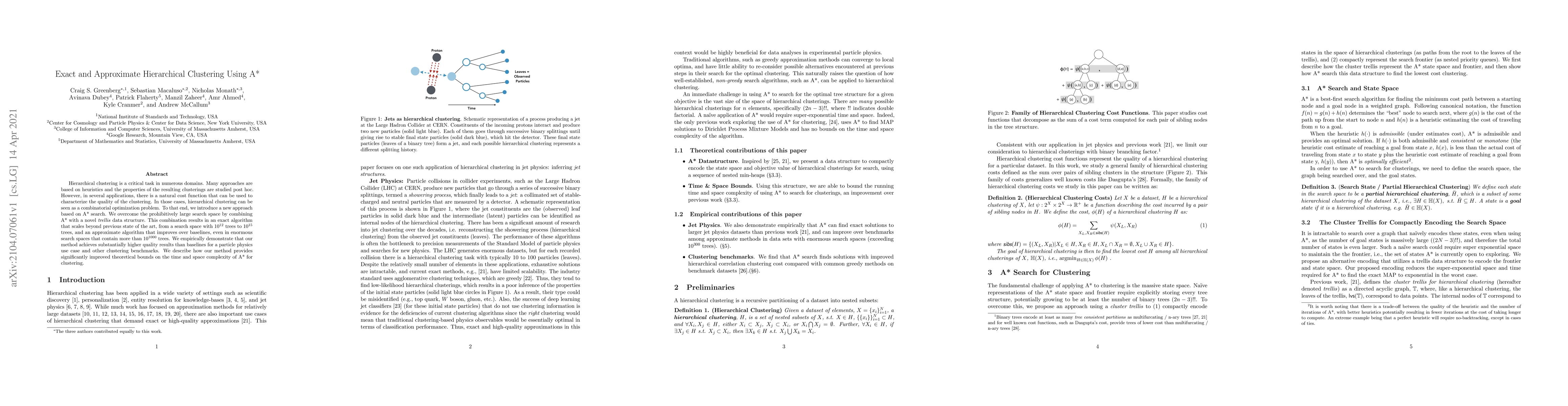 This paper presents an A* search-based approach for exact and approximate hierarchical clustering, utilizing a novel trellis data structure to manage large search spaces. The method achieves superior clustering quality compared to baselines, scaling from $10^{12}$ to $10^{15}$ trees exactly and handling spaces with over $10^{1000}$ trees approximately.