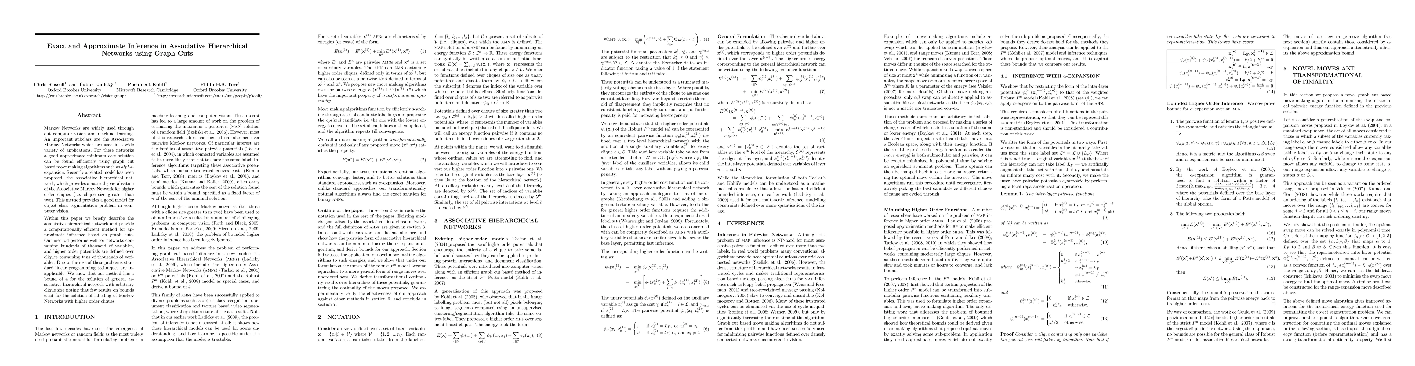 This paper introduces associative hierarchical networks, a generalization of associative Markov networks for higher order cliques, and presents an efficient graph cut-based method for approximate inference. The proposed method effectively handles large-scale problems with hundreds of thousands of variables and performs well in computer vision applications like object class segmentation.