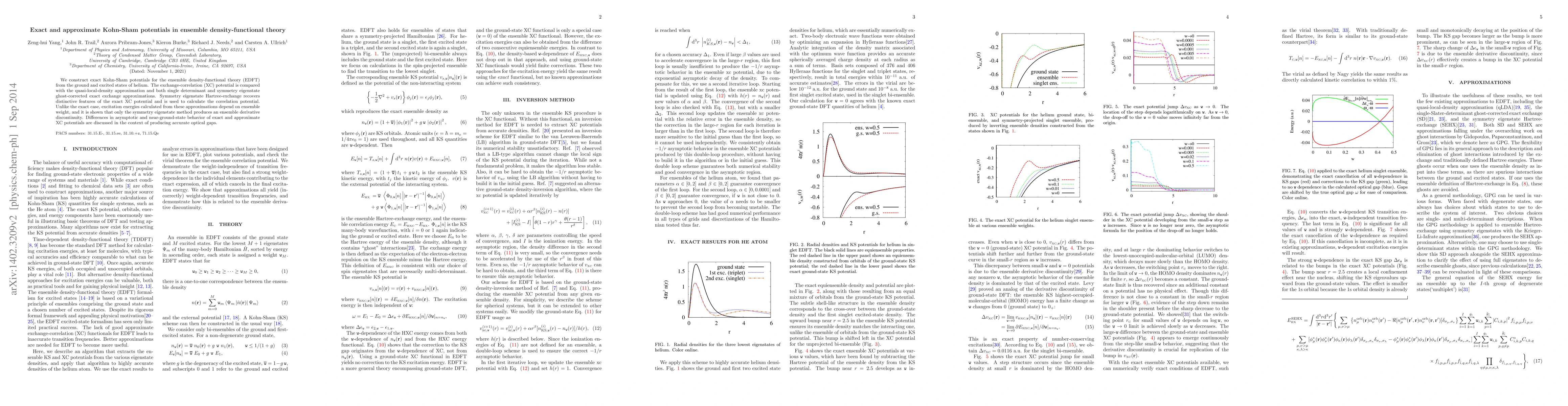We construct exact Kohn-Sham potentials for the ensemble density-functional theory (EDFT) from the ground and excited states of helium. The exchange-correlation (XC) potential is compared with the quasi-local-density approximation and both single determinant and symmetry eigenstate ghost-corrected exact exchange approximations. Symmetry eigenstate Hartree-exchange recovers distinctive features of the exact XC potential and is used to calculate the correlation potential. Unlike the exact case, excitation energies calculated from these approximations depend on ensemble weight, and it is shown that only the symmetry eigenstate method produces an ensemble derivative discontinuity. Differences in asymptotic and near-ground-state behavior of exact and approximate XC potentials are discussed in the context of producing accurate optical gaps.