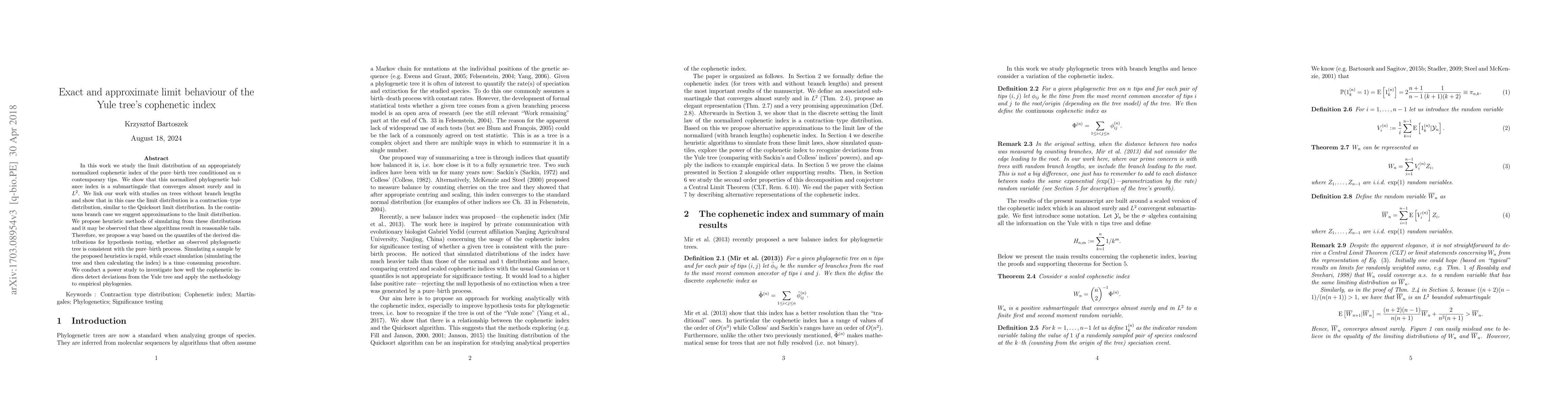 The paper investigates the limit distribution of a phylogenetic balance index for pure-birth trees, showing it converges almost surely and in L2, with proposed approximations and heuristic simulation methods for hypothesis testing.