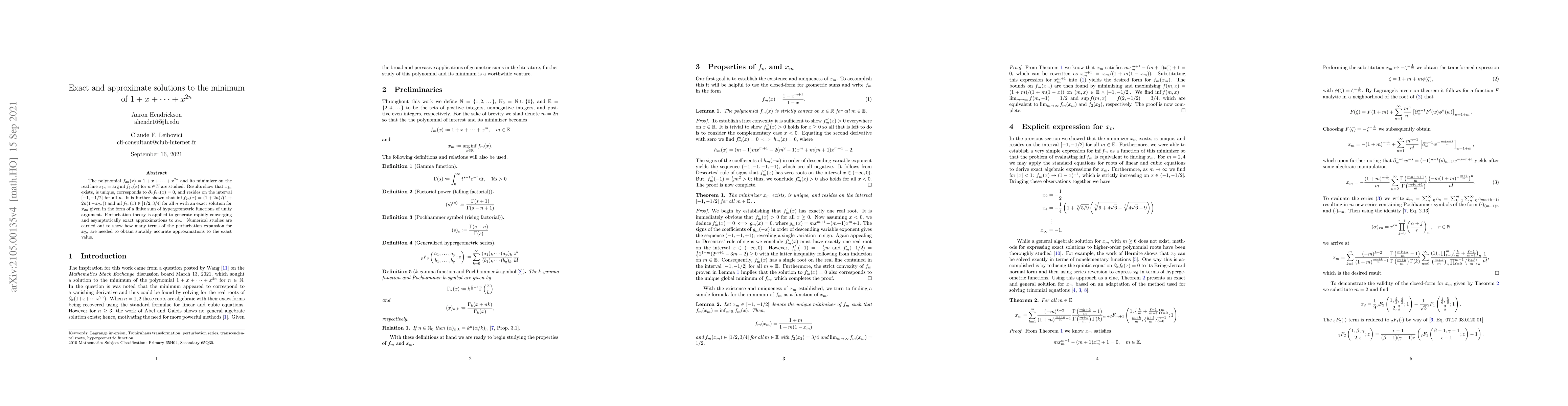 The polynomial $f_{2n}(x)=1+x+\cdots+x^{2n}$ and its minimizer on the real line $x_{2n}=\operatorname{arg\,inf} f_{2n}(x)$ for $n\in\Bbb N$ are studied. Results show that $x_{2n}$ exists, is unique, corresponds to $\partial_x f_{2n}(x)=0$, and resides on the interval $[-1,-1/2]$ for all $n$. It is further shown that $\inf f_{2n}(x)=(1+2n)/(1+2n(1-x_{2n}))$ and $\inf f_{2n}(x)\in[1/2,3/4]$ for all $n$ with an exact solution for $x_{2n}$ given in the form of a finite sum of hypergeometric functions of unity argument. Perturbation theory is applied to generate rapidly converging and asymptotically exact approximations to $x_{2n}$. Numerical studies are carried out to show how many terms of the perturbation expansion for $x_{2n}$ are needed to obtain suitably accurate approximations to the exact value.