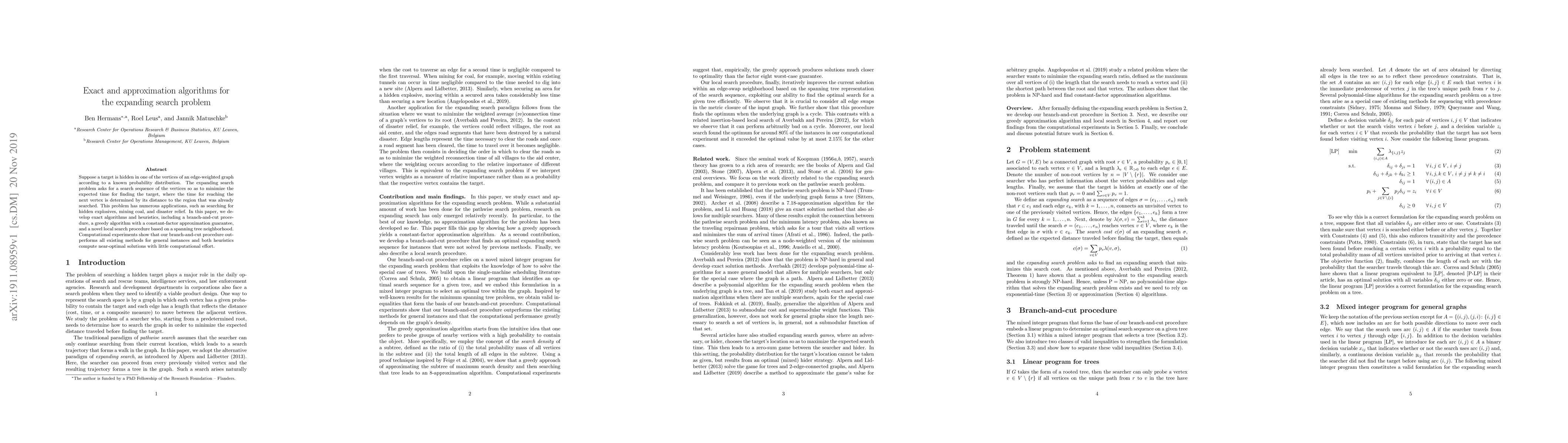 Suppose a target is hidden in one of the vertices of an edge-weighted graph according to a known probability distribution. The expanding search problem asks for a search sequence of the vertices so as to minimize the expected time for finding the target, where the time for reaching the next vertex is determined by its distance to the region that was already searched. This problem has numerous applications, such as searching for hidden explosives, mining coal, and disaster relief. In this paper, we develop exact algorithms and heuristics, including a branch-and-cut procedure, a greedy algorithm with a constant-factor approximation guarantee, and a novel local search procedure based on a spanning tree neighborhood. Computational experiments show that our branch-and-cut procedure outperforms all existing methods for general instances and both heuristics compute near-optimal solutions with little computational effort.