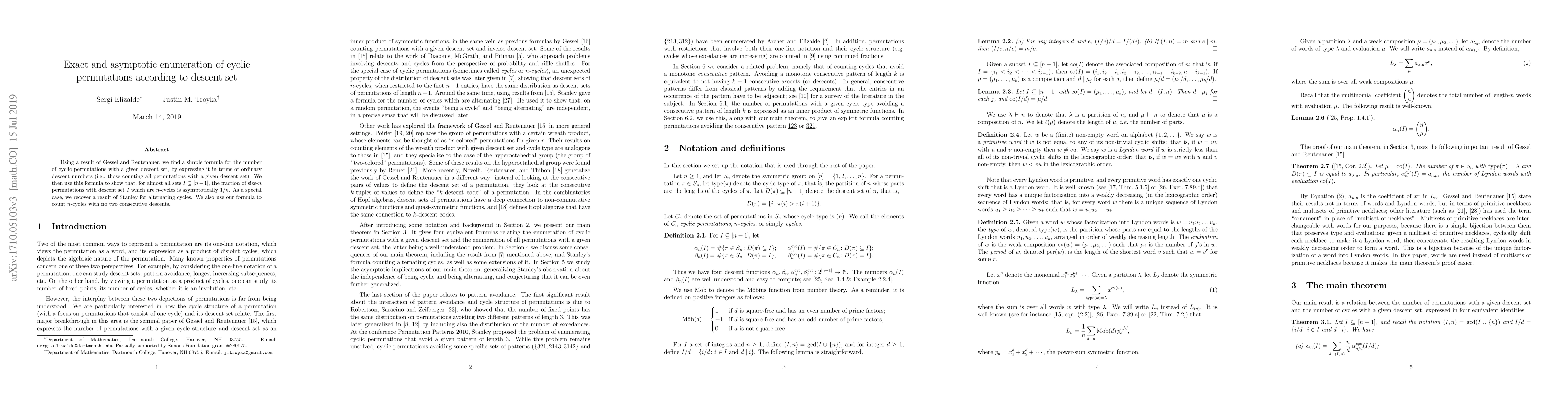 This paper provides a formula for counting cyclic permutations based on their descent sets, derived from Gessel and Reutenauer's work, and demonstrates that nearly all size-$n$ permutations with descent set $I$ are $n$-cycles asymptotically $1/n$. The study also counts cycles without two consecutive descents.