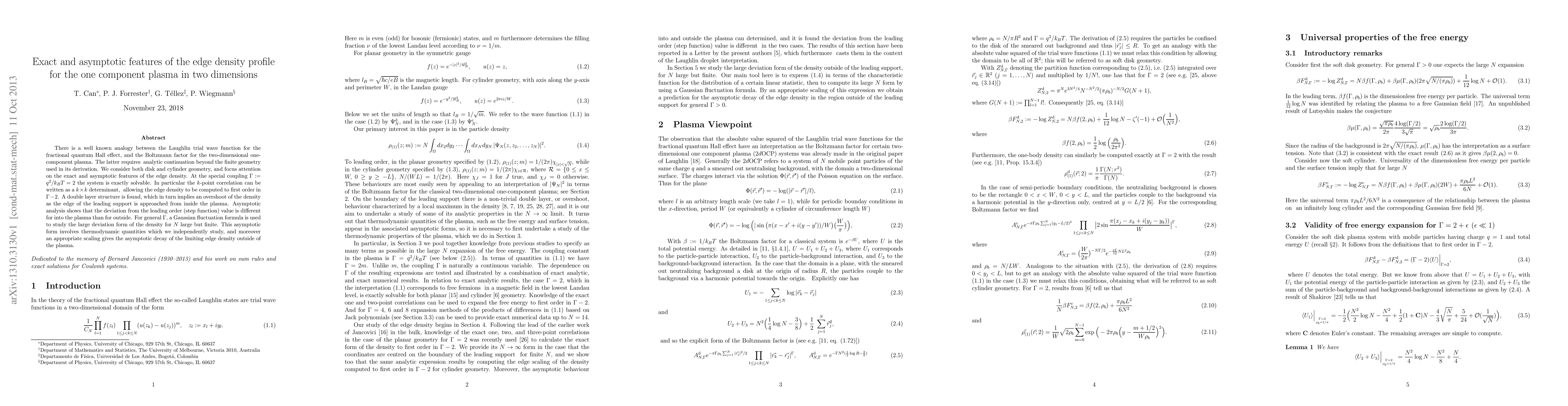 There is a well known analogy between the Laughlin trial wave function for the fractional quantum Hall effect, and the Boltzmann factor for the two-dimensional one-component plasma. The latter requires analytic continuation beyond the finite geometry used in its derivation. We consider both disk and cylinder geometry, and focus attention on the exact and asymptotic features of the edge density. At the special coupling \Gamma := q^2/k_BT=2 the system is exactly solvable. In particular the k-point correlation can be written as a k \times k determinant, allowing the edge density to be computed to first order in \Gamma - 2. A double layer structure is found, which in turn implies an overshoot of the density as the edge of the leading support is approached from inside the plasma. Asymptotic analysis shows that the deviation from the leading order (step function) value is different for into the plasma than for outside. For general \Gamma, a Gaussian fluctuation formula is used to study the large deviation form of the density for N large but finite. This asymptotic form involves thermodynamic quantities which we independently study, and moreover an appropriate scaling gives the asymptotic decay of the limiting edge density outside of the plasma.