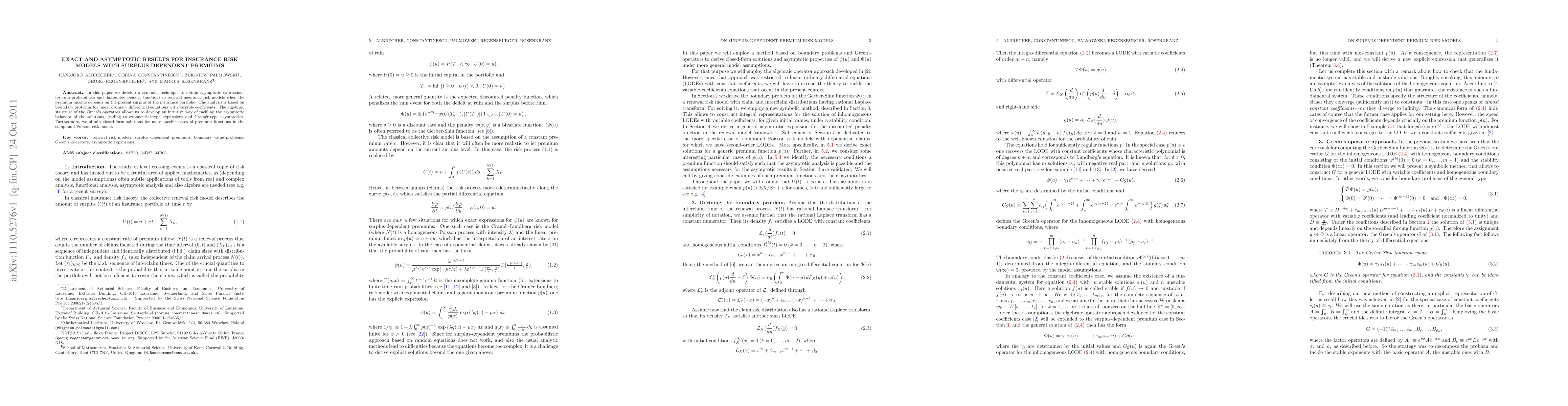 This paper introduces a symbolic technique to derive asymptotic expressions for ruin probabilities and discounted penalty functions in insurance risk models where premiums depend on current surplus. It leverages boundary problems for linear ODEs and Green's operators to achieve exponential-type expansions and Cramér-type asymptotics, with closed-form solutions for specific premium functions in the compound Poisson risk model.