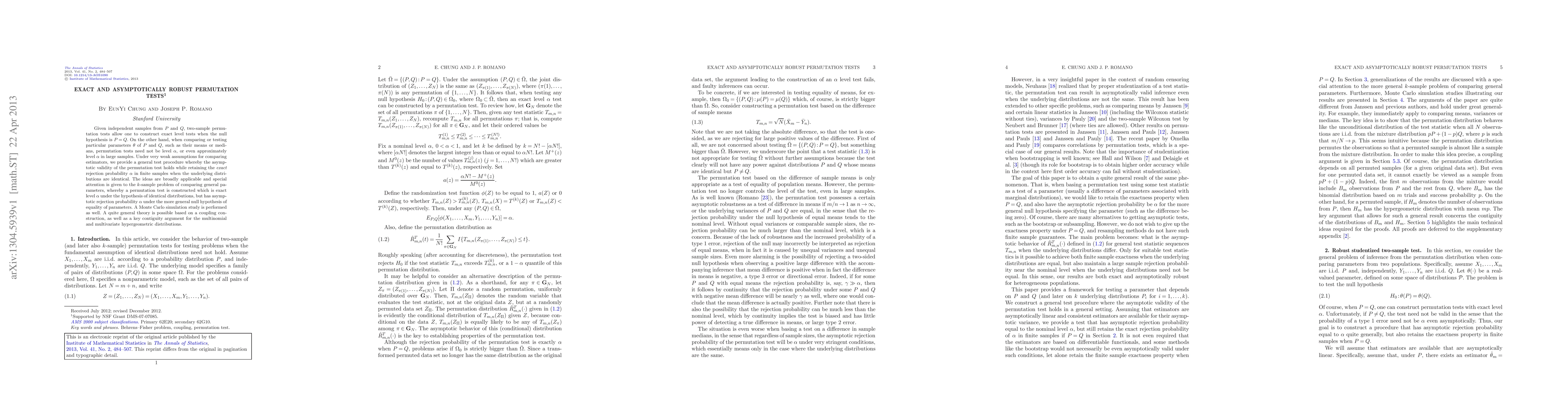 Given independent samples from P and Q, two-sample permutation tests allow one to construct exact level tests when the null hypothesis is P=Q. On the other hand, when comparing or testing particular parameters $\theta$ of P and Q, such as their means or medians, permutation tests need not be level $\alpha$, or even approximately level $\alpha$ in large samples. Under very weak assumptions for comparing estimators, we provide a general test procedure whereby the asymptotic validity of the permutation test holds while retaining the exact rejection probability $\alpha$ in finite samples when the underlying distributions are identical. The ideas are broadly applicable and special attention is given to the k-sample problem of comparing general parameters, whereby a permutation test is constructed which is exact level $\alpha$ under the hypothesis of identical distributions, but has asymptotic rejection probability $\alpha$ under the more general null hypothesis of equality of parameters. A Monte Carlo simulation study is performed as well. A quite general theory is possible based on a coupling construction, as well as a key contiguity argument for the multinomial and multivariate hypergeometric distributions.