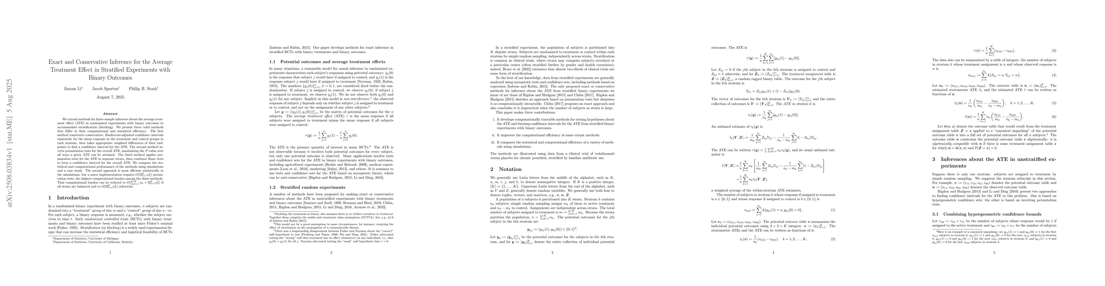 We extend methods for finite-sample inference about the average treatment effect (ATE) in randomized experiments with binary outcomes to accommodate stratification (blocking). We present three valid methods that differ in their computational and statistical efficiency. The first method constructs conservative, Bonferroni-adjusted confidence intervals separately for the mean response in the treatment and control groups in each stratum, then takes appropriate weighted differences of their endpoints to find a confidence interval for the ATE. The second method inverts permutation tests for the overall ATE, maximizing the $P$-value over all ways a given ATE can be attained. The third method applies permutation tests for the ATE in separate strata, then combines those tests to form a confidence interval for the overall ATE. We compare the statistical and computational performance of the methods using simulations and a case study. The second approach is most efficient statistically in the simulations, but a naive implementation requires O(\Pi_{k=1}^{K} n_{k}^{4}) permutation tests, the highest computational burden among the three methods. That computational burden can be reduced to O(\sum_{k=1}^K n_k \times\Pi_{k=1}^{K} n_{k}^{2}) if all strata are balanced and to O(\Pi_{k=1}^{K} n_{k}^{3}) otherwise.